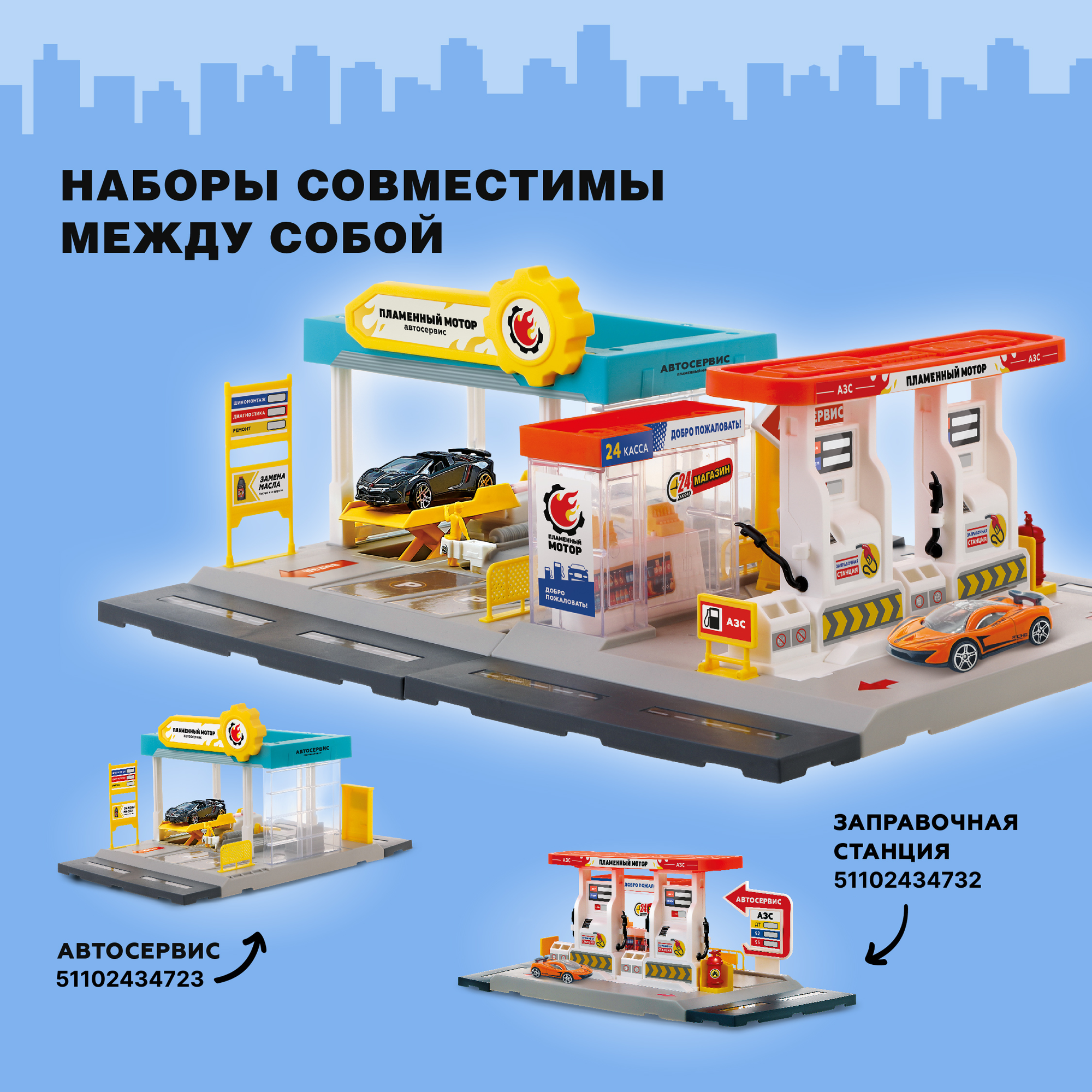 Заправочная станция пламенный мотор , 2 колонки с двусторонним заездом, подвижные шланги, машина интересное: