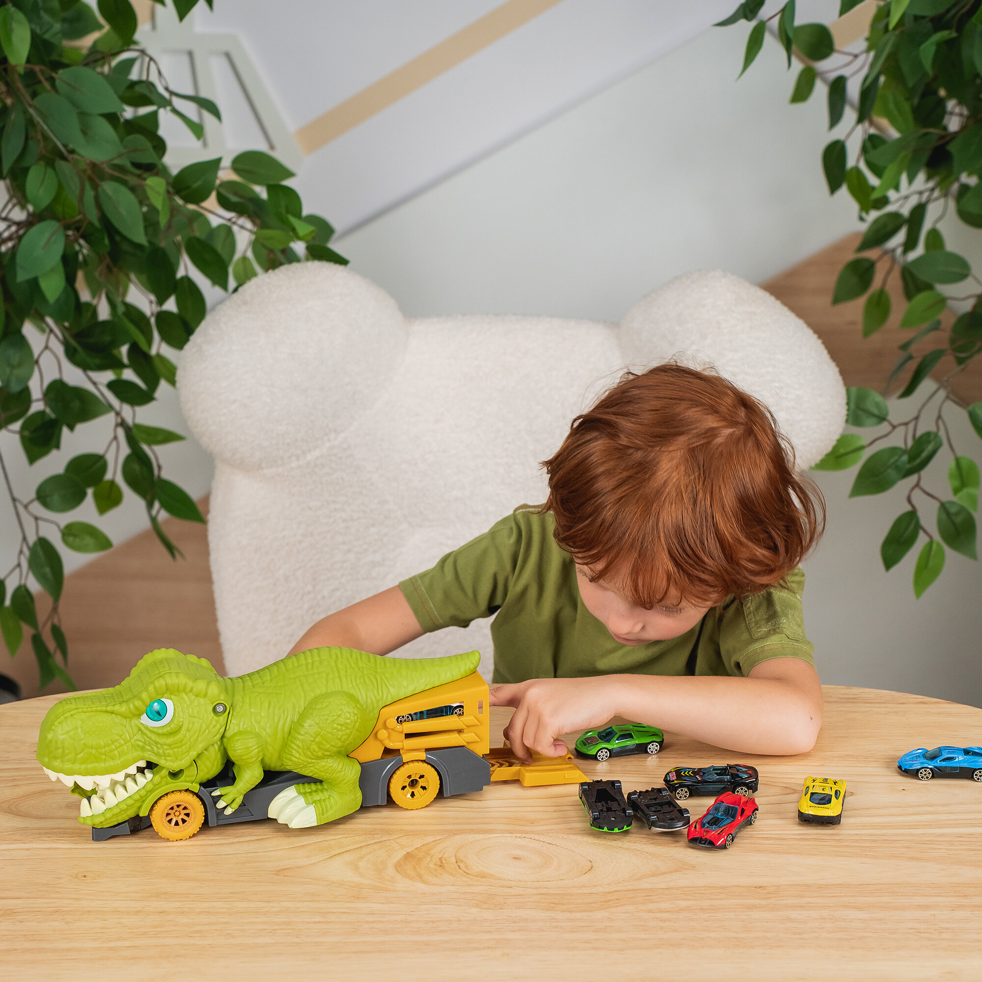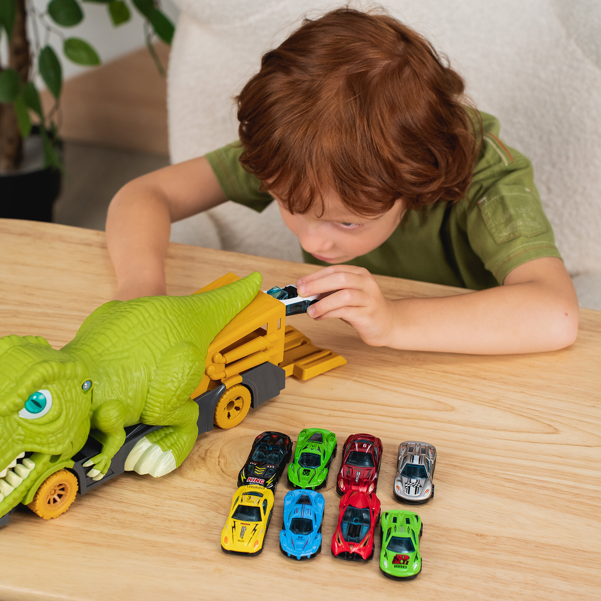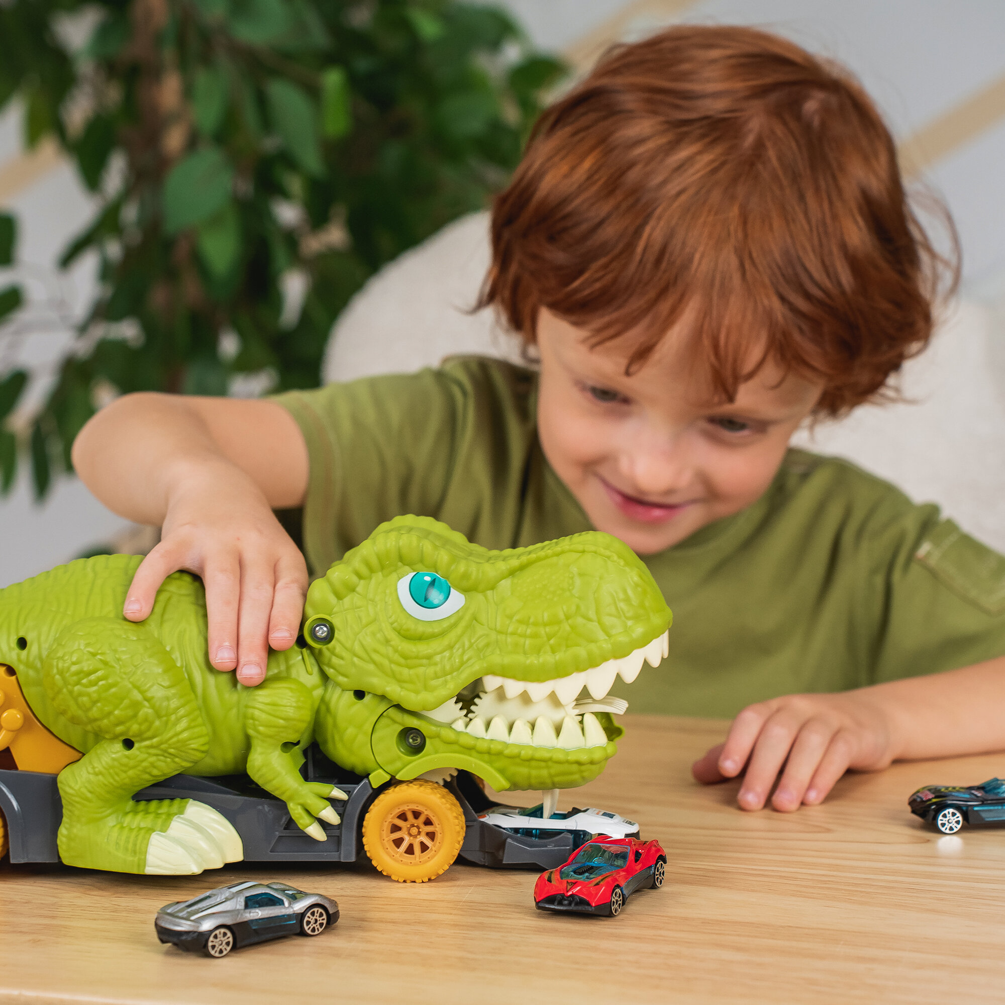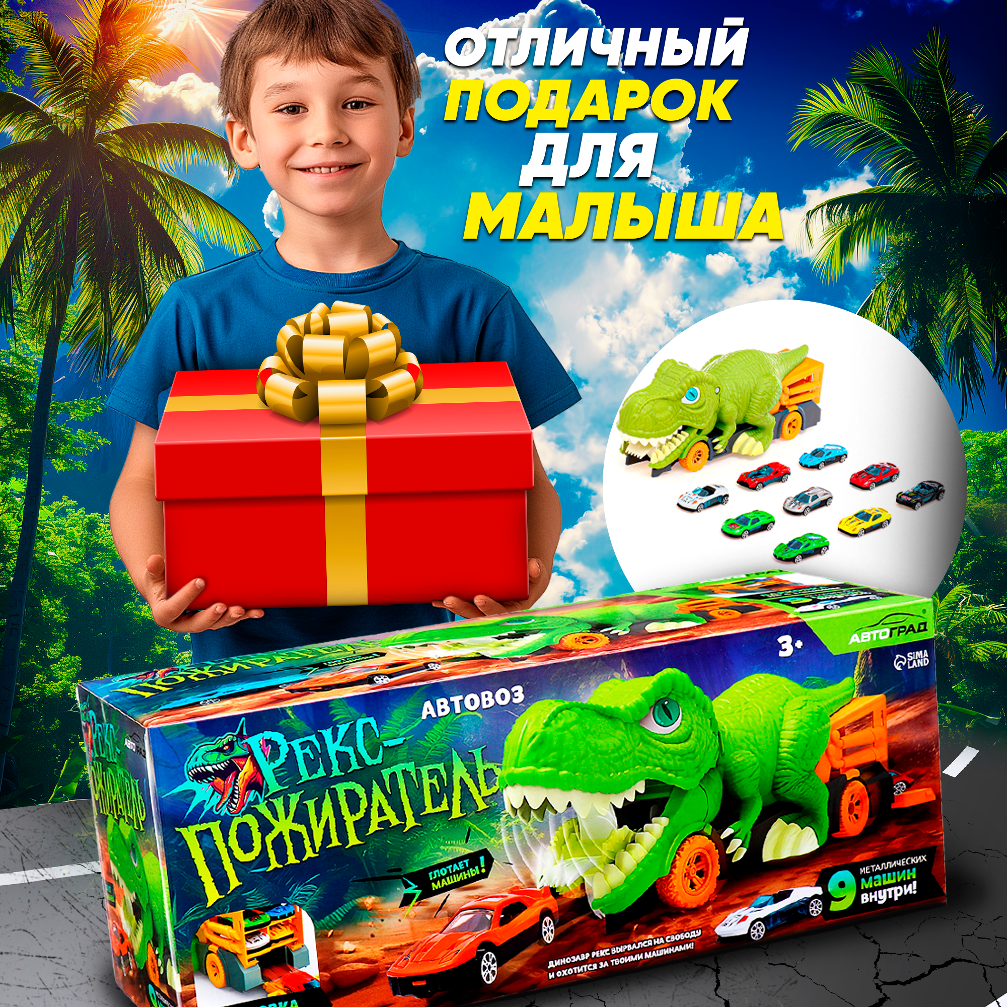 Машинка автовоз динозавр "Рекс-пожиратель" 32 см, 9 машин, автоград интересное: