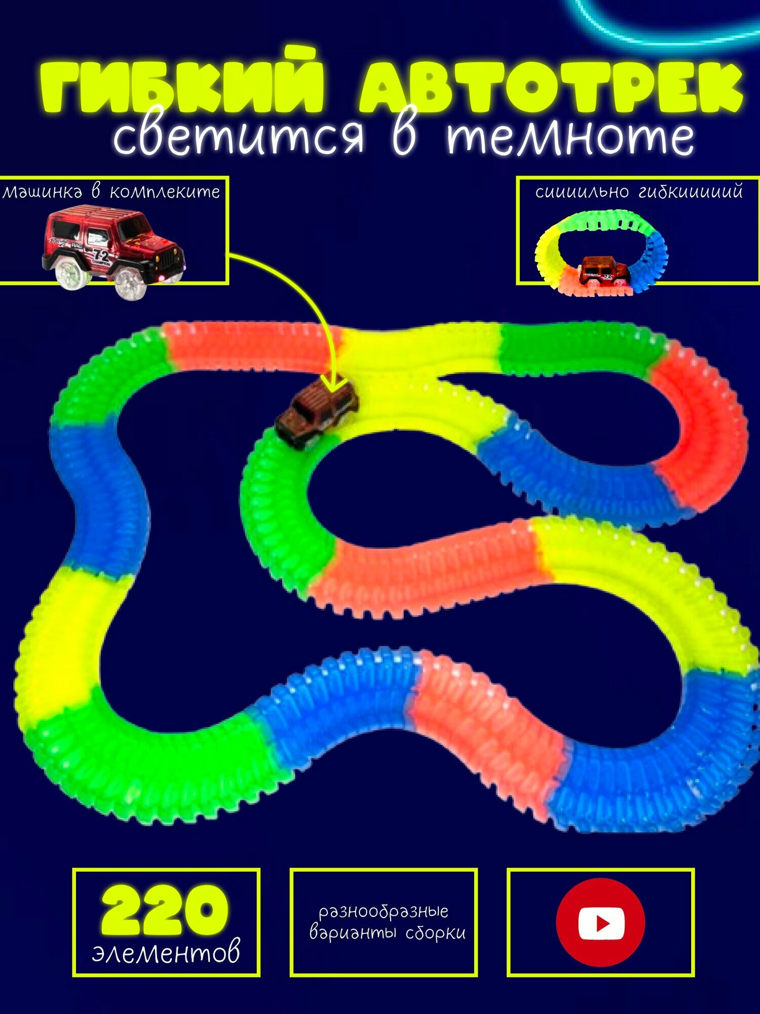 Купить Гибкий гоночный трек "Волшебная трасса" 220 элементов с машинкой светится в темноте