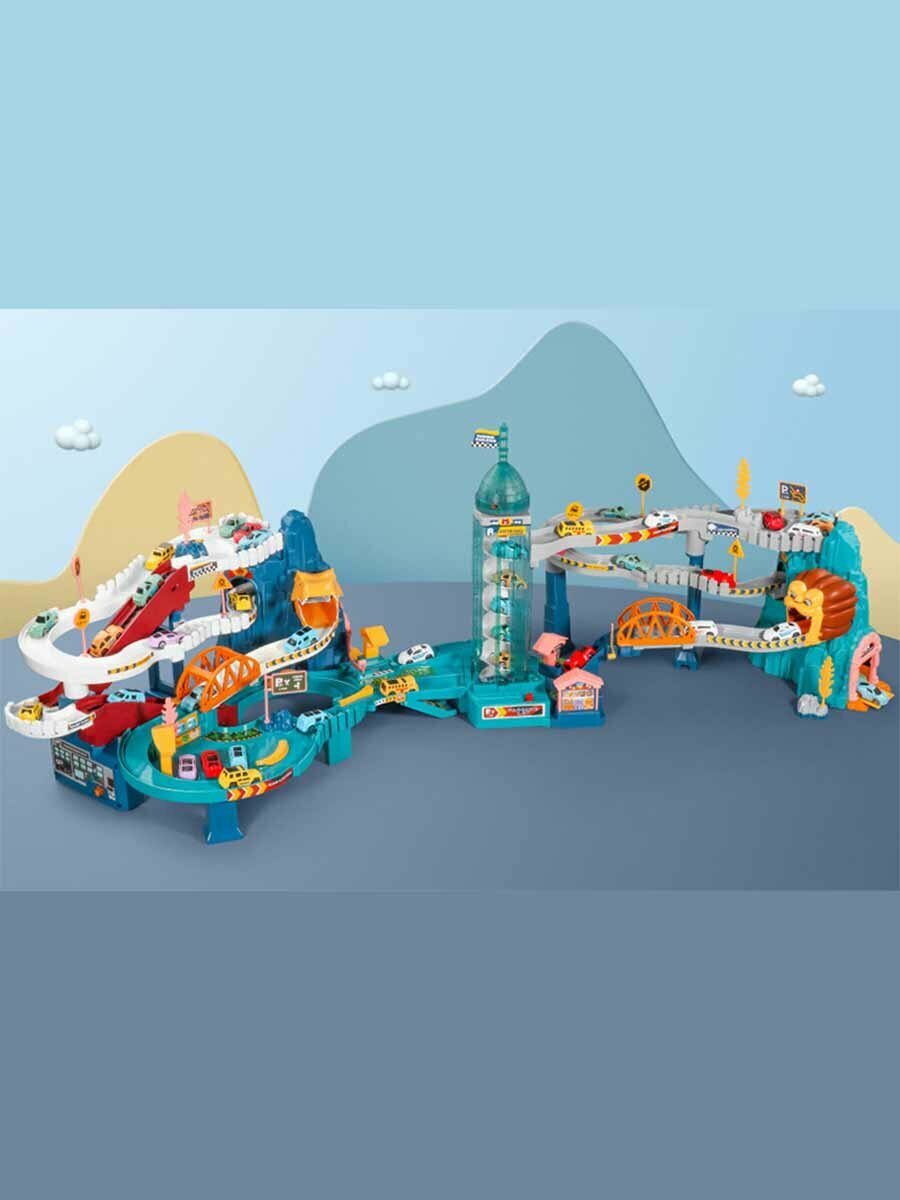 Купить Автотрек большой многоуровневый детский Лев и Динозавр Мультитрек сборный свет звук автолифт парковка с машинками