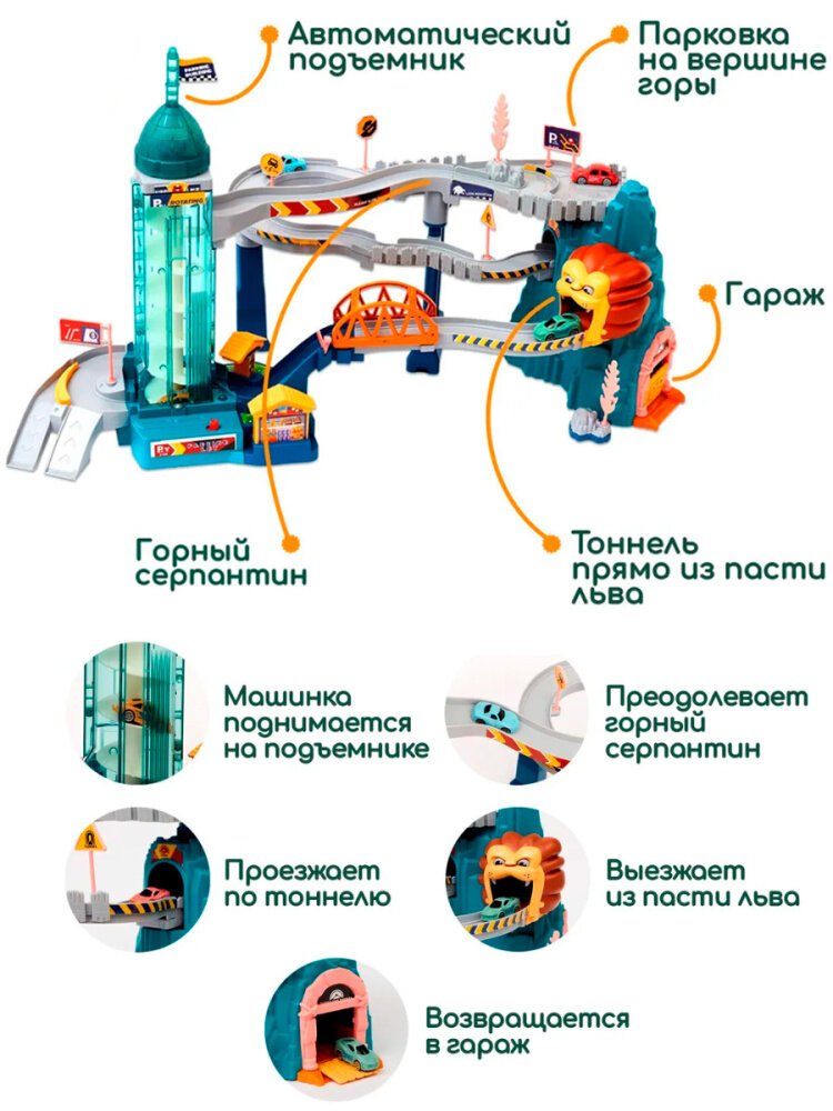 СохранитьАвтотрек большой многоуровневый детский Лев и Динозавр Мультитрек сборный свет звук автолифт парковка с машинками интересное: