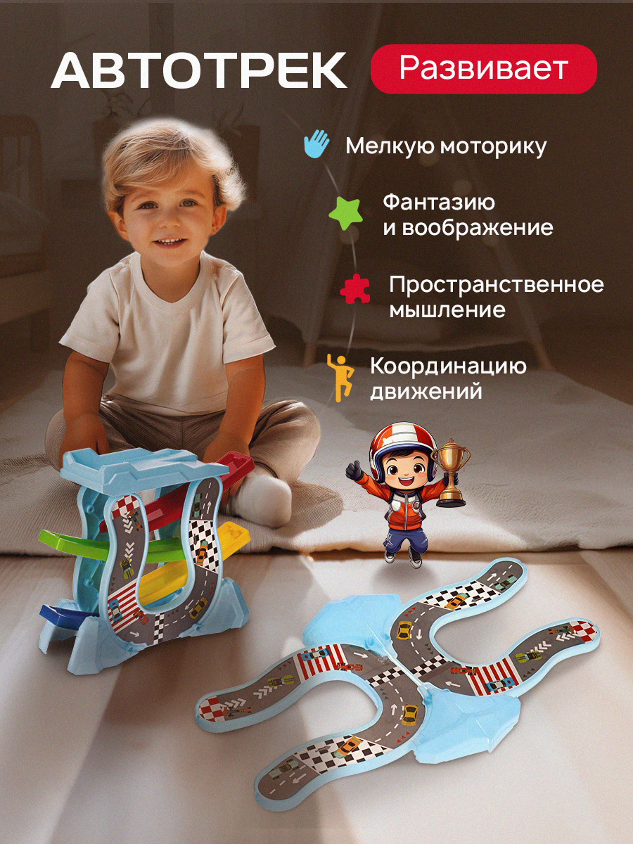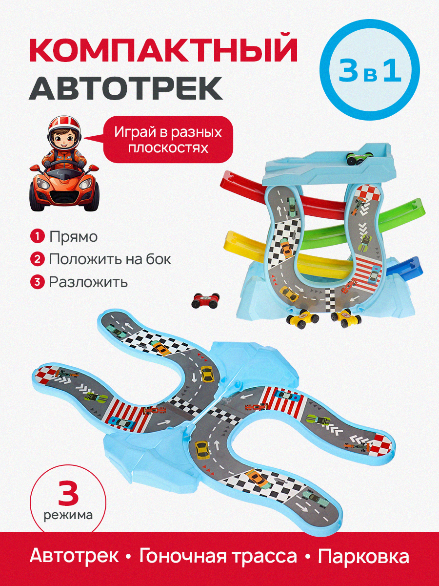 Автотрек многоуровневый с 4 -мя машинками 3в1, размер в собранном виде 21.3 см. Артикул 2106759 интересное: