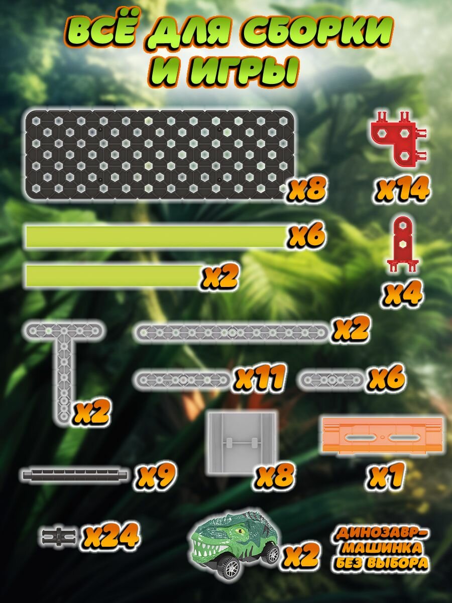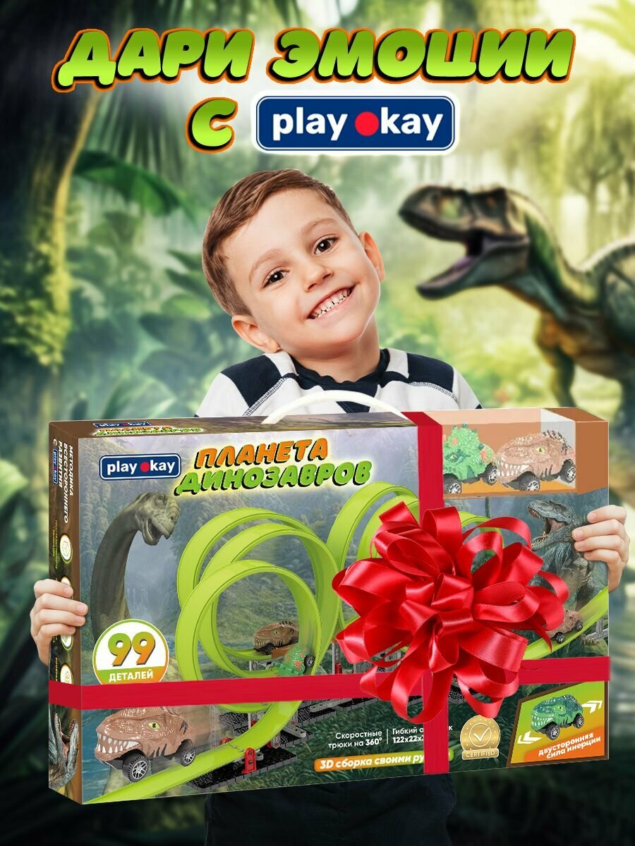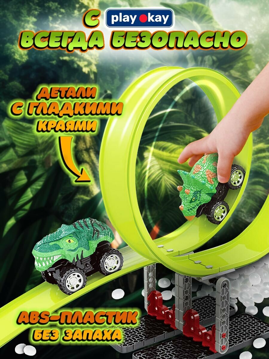 Автотрек с машинками динозаврами на магнитах Play Okay, гибкий детский гоночный трек Мертвая петля, 99 деталей интересное: