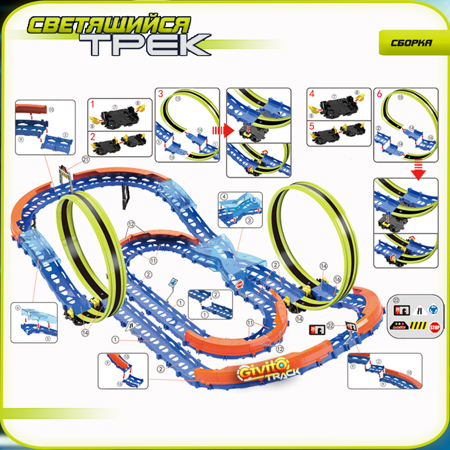 Детский гоночный светящийся гибкий автотрек Givito (2 петли 360°), 2 машинки-перевертыша, 116 деталей G2412-498