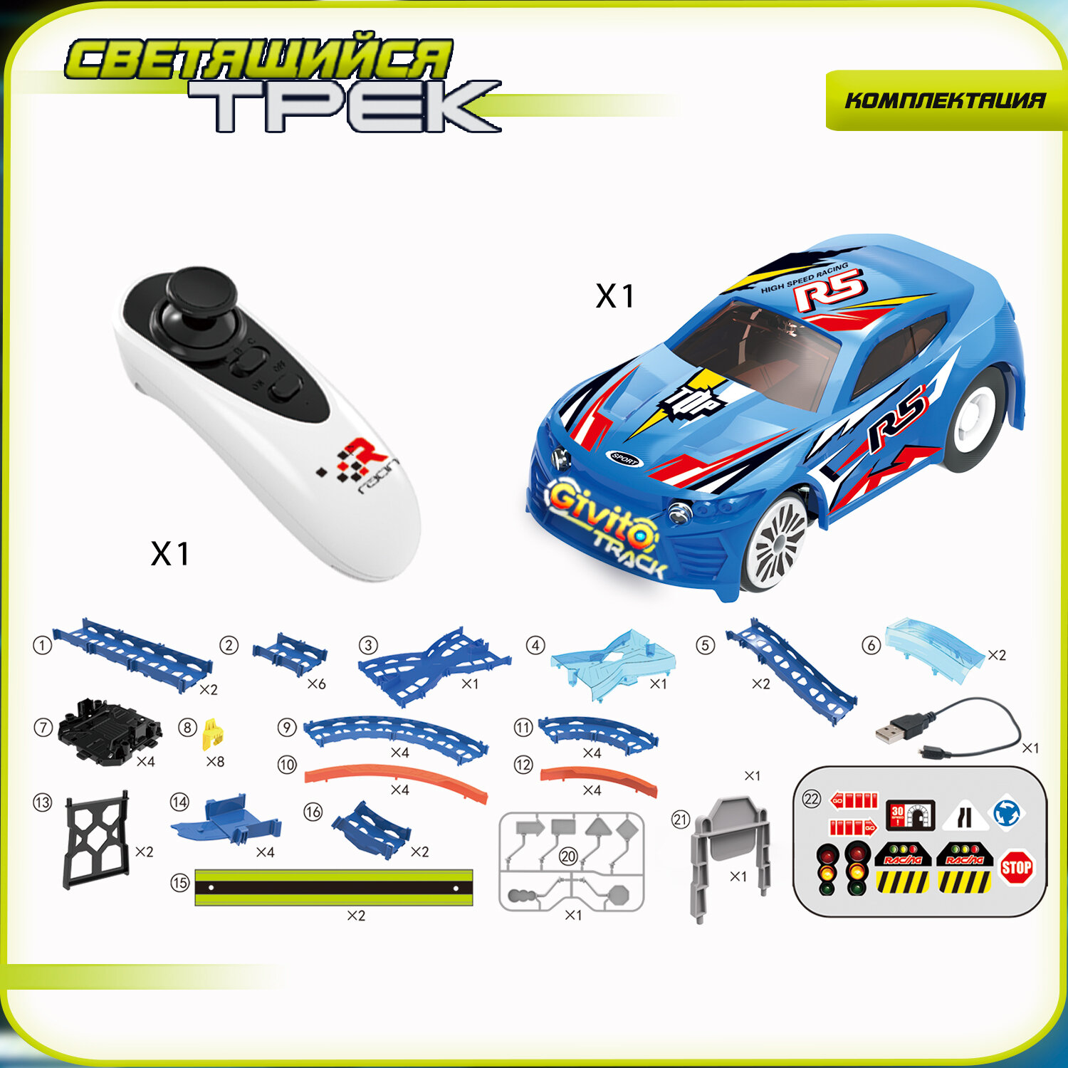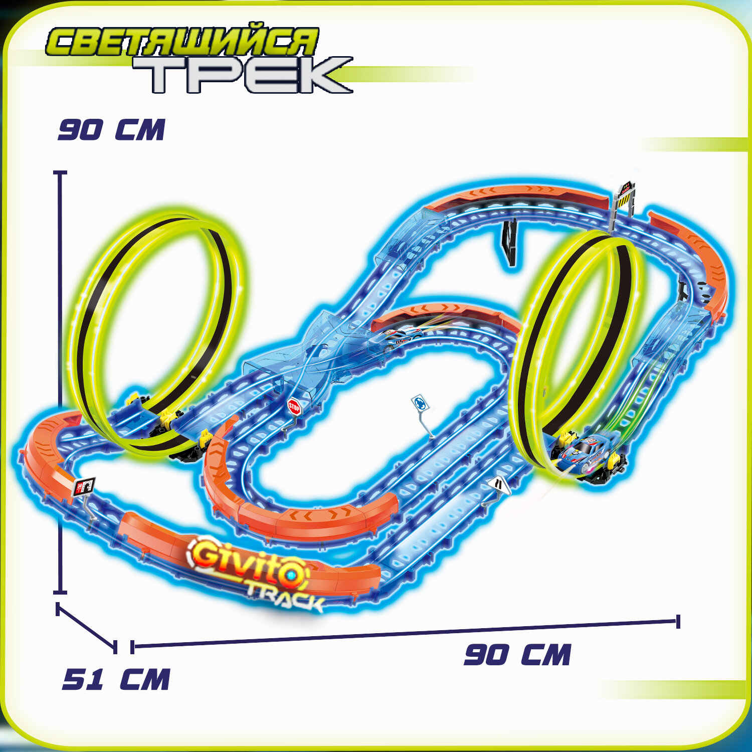 Купить Детский гоночный светящийся гибкий автотрек Givito с машинкой на пульте управления (2 петли 360°), 58 деталей G2412-494