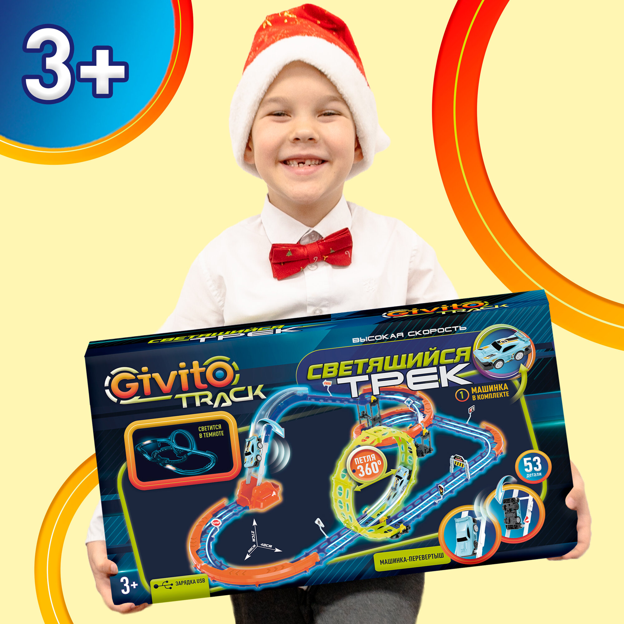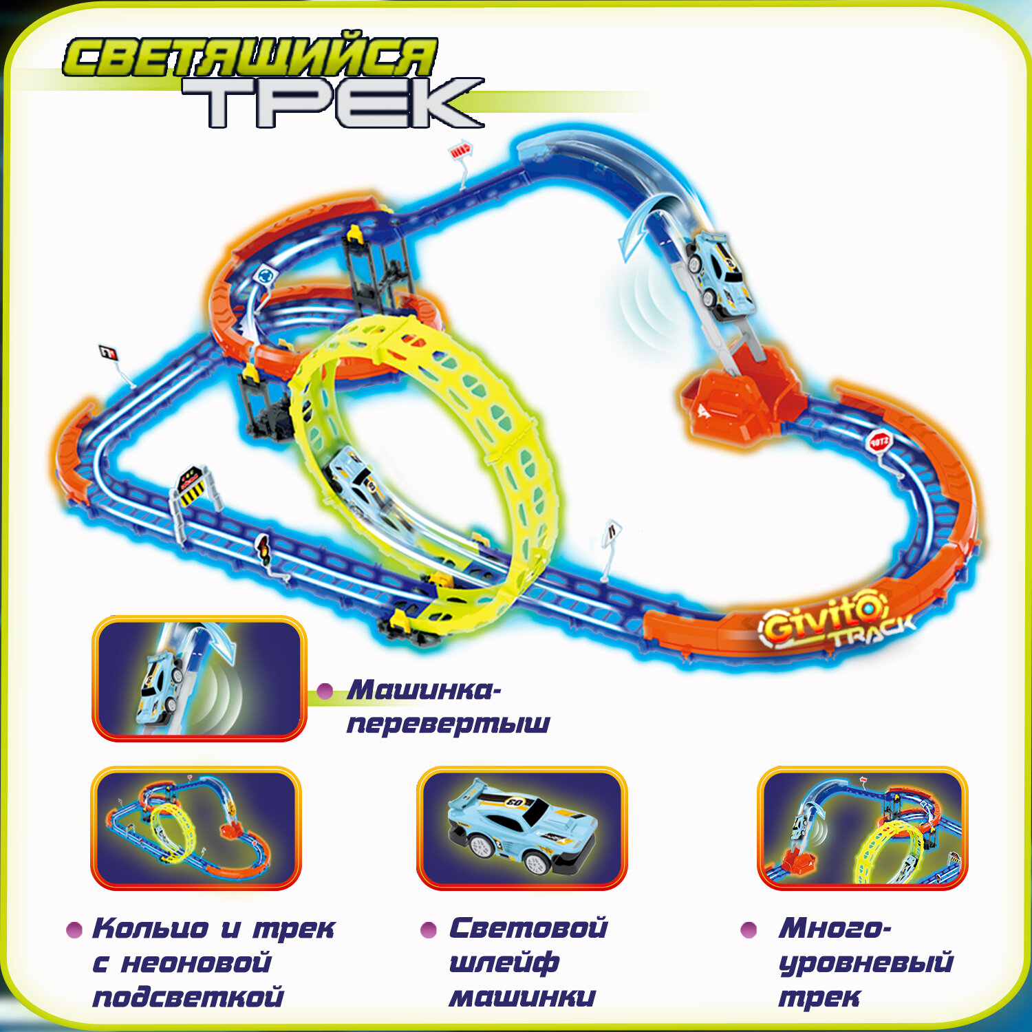 Купить Детский гоночный светящийся гибкий автотрек Givito с машинкой-перевертышем (петля 360°), 53 детали G2412-496