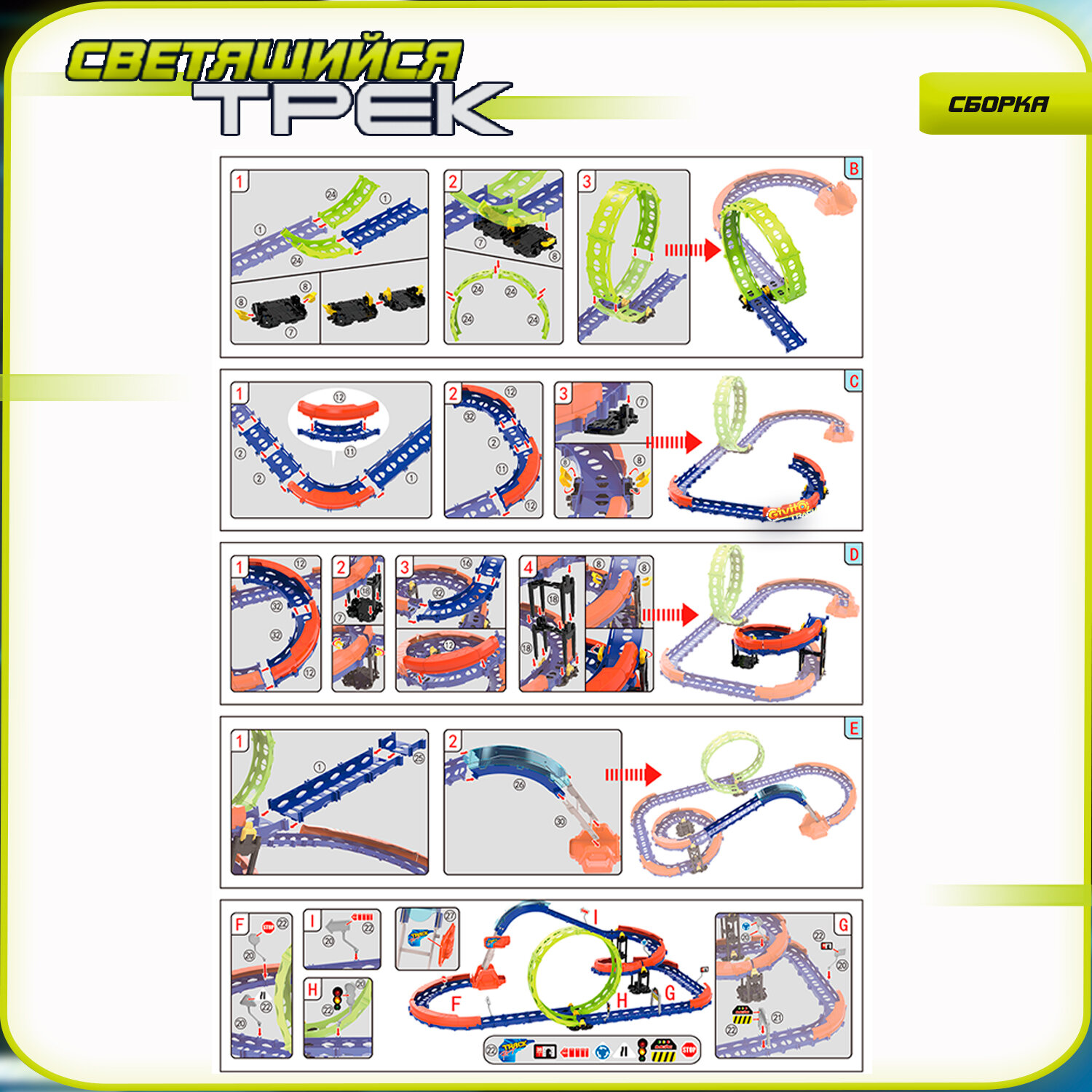 СохранитьДетский гоночный светящийся гибкий автотрек Givito с машинкой-перевертышем (петля 360°), 53 детали G2412-496 интересное: