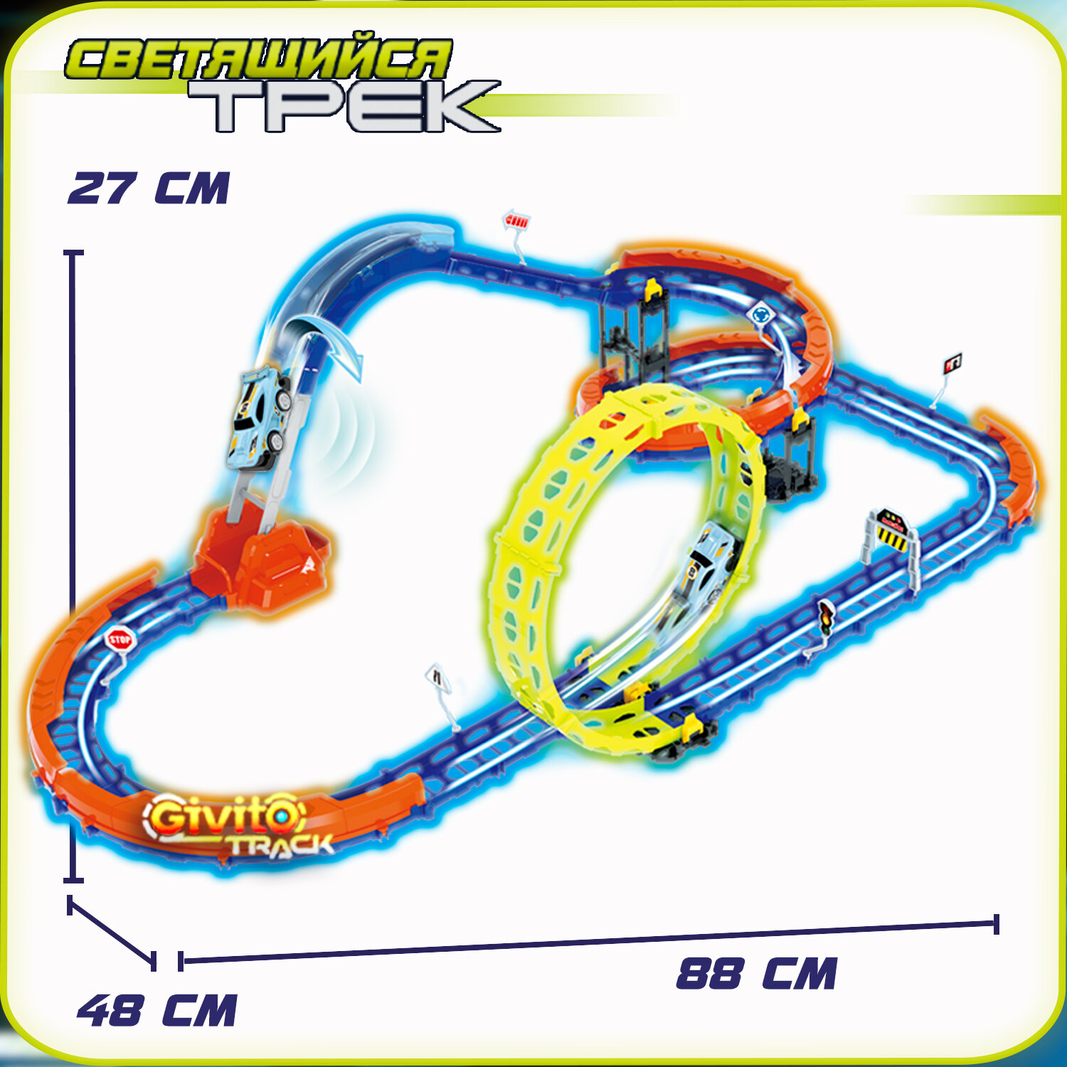 Детский гоночный светящийся гибкий автотрек Givito с машинкой (2 петли 360°), 63 детали G2412-495