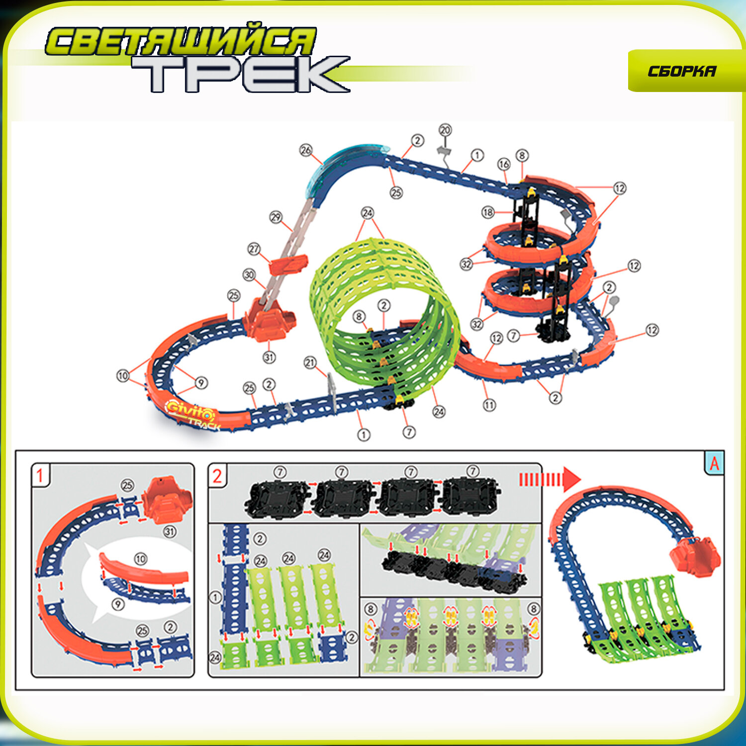 Детский гоночный светящийся гибкий автотрек Givito (2 петли 360°), 2 машинки-перевертыша, 116 деталей G2412-498
