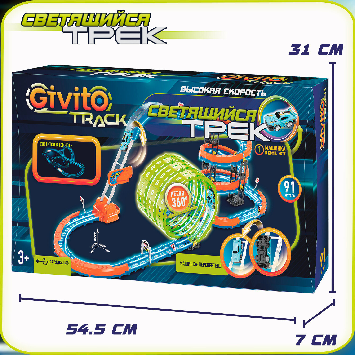 Детский гоночный светящийся гибкий автотрек Givito с машинкой (2 петли 360°), 63 детали G2412-495