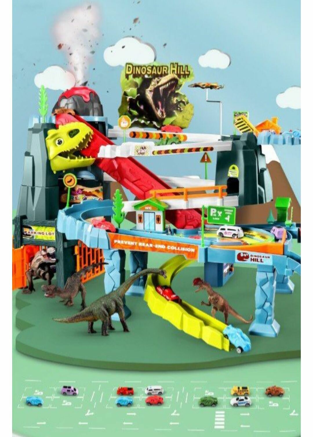 Автотрек "Скоростное шоссе с динозавром", парковка для машинок, игрушка для детей, трек с машинками