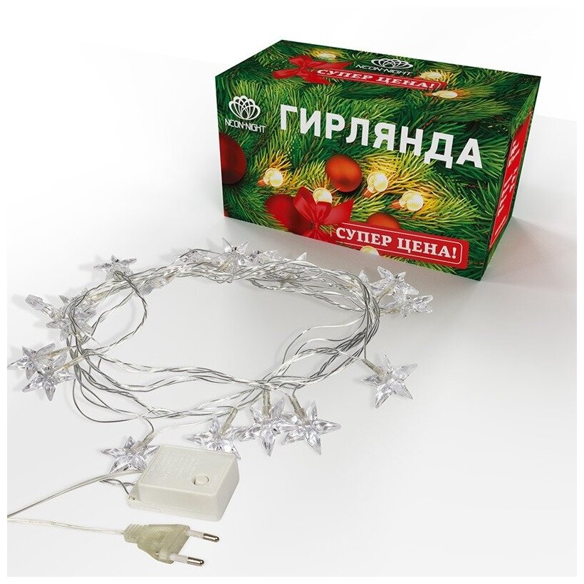 Светодиодная гирлянда NEON-NIGHT "Звездочки" 2.8 м, 8 режимов, 20 звезд красного свечения, прозрачный провод