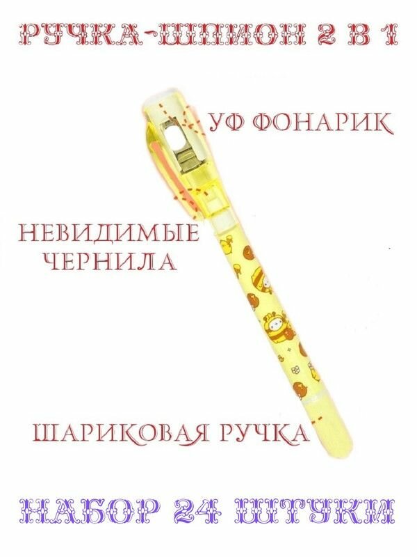 Набор 24 Ручки-шпион с невидимыми чернилами + ультрафиолетовый фонарик + шариковая ручка желтая интересное: