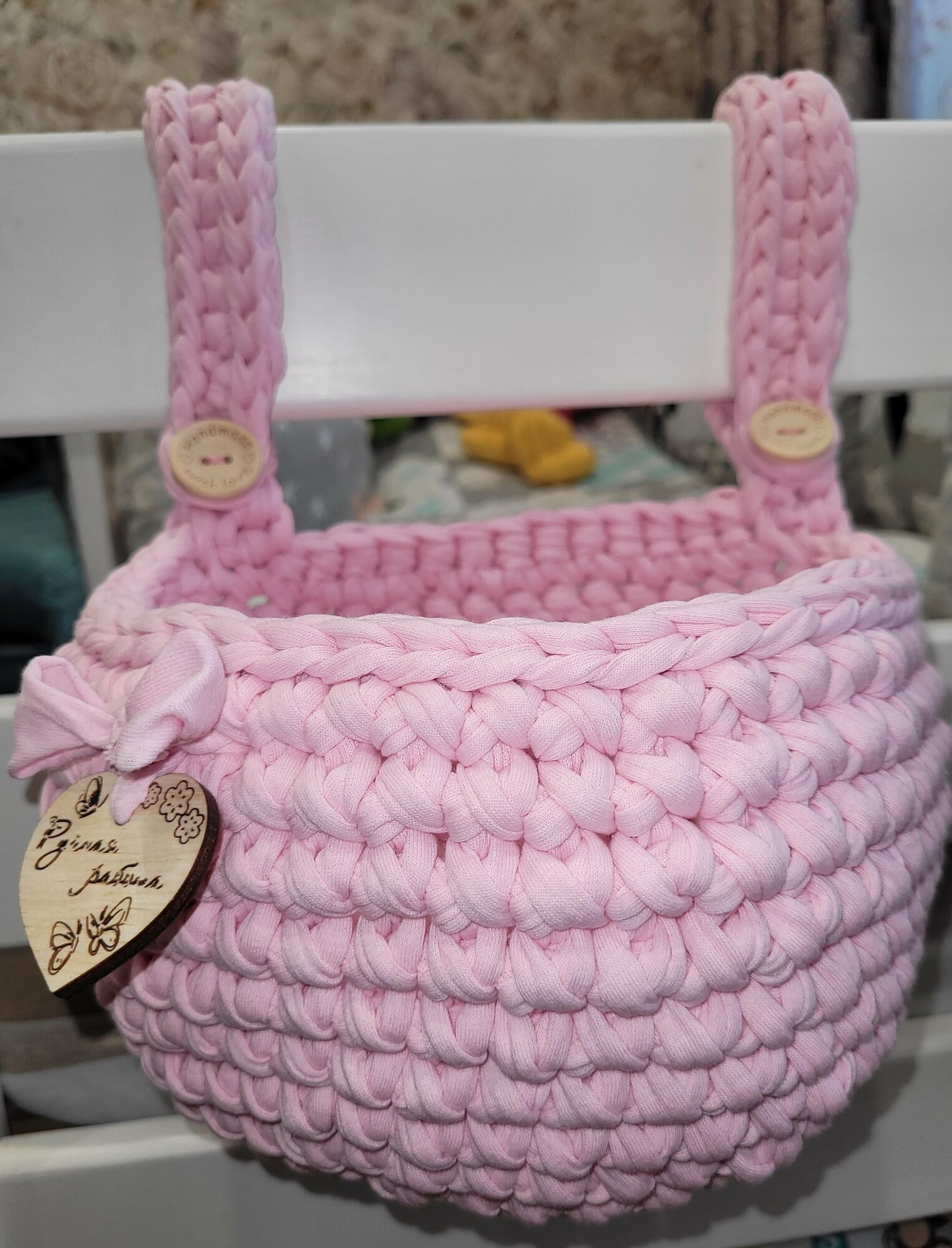 Подвесная корзинка/ вязаный кармашек на детскую кроватку/ нежно- розовая интересное: