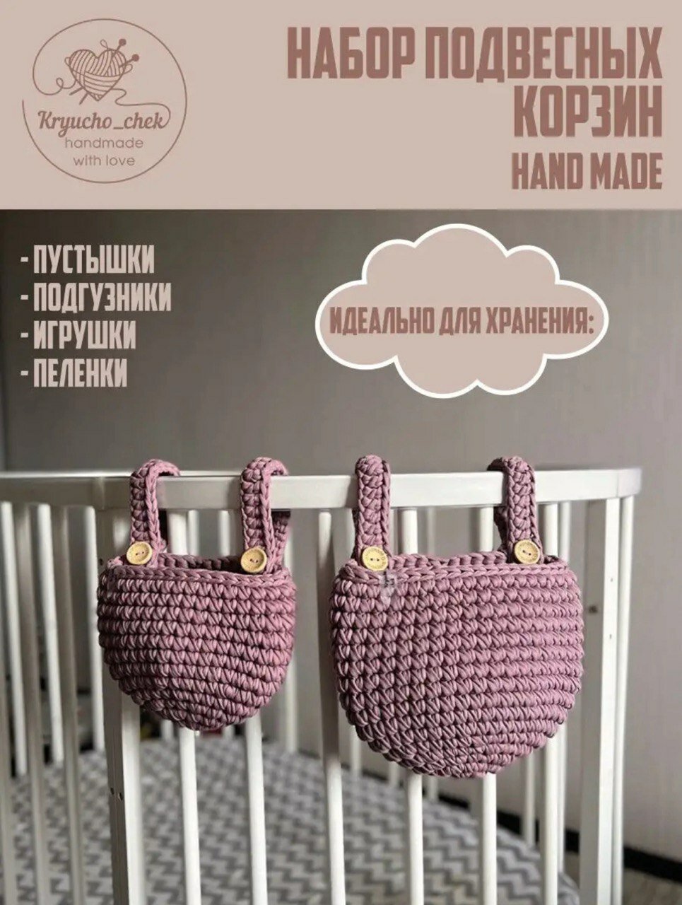 Набор из 2-х корзин /подвесная корзинка/ вязаный кармашек на детскую кроватку/цвет-пыльная роза интересное: