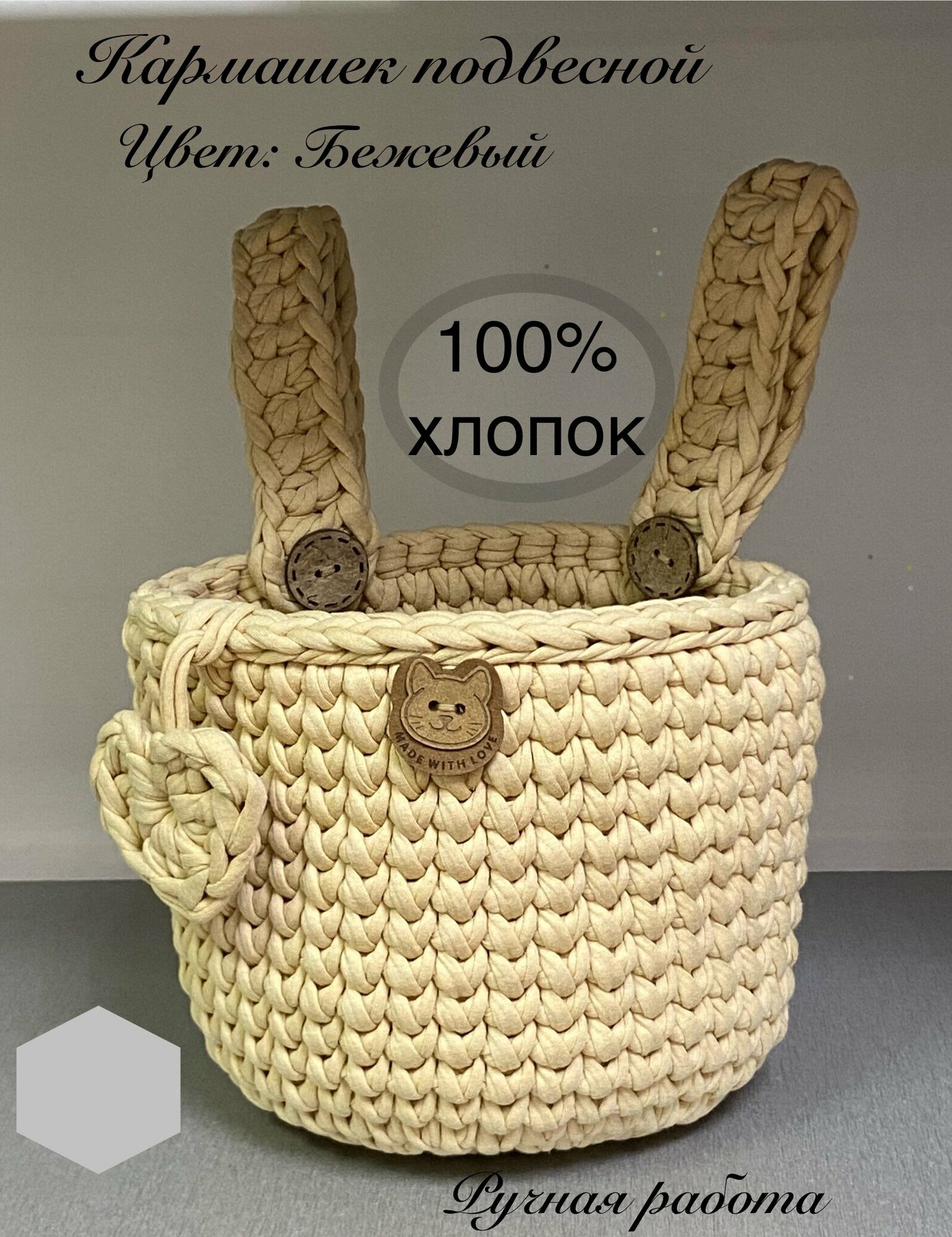 Купить Подвесной органайзер, вязаный кармашек на детскую кроватку, хлопок 100%, бежевый с сердцем