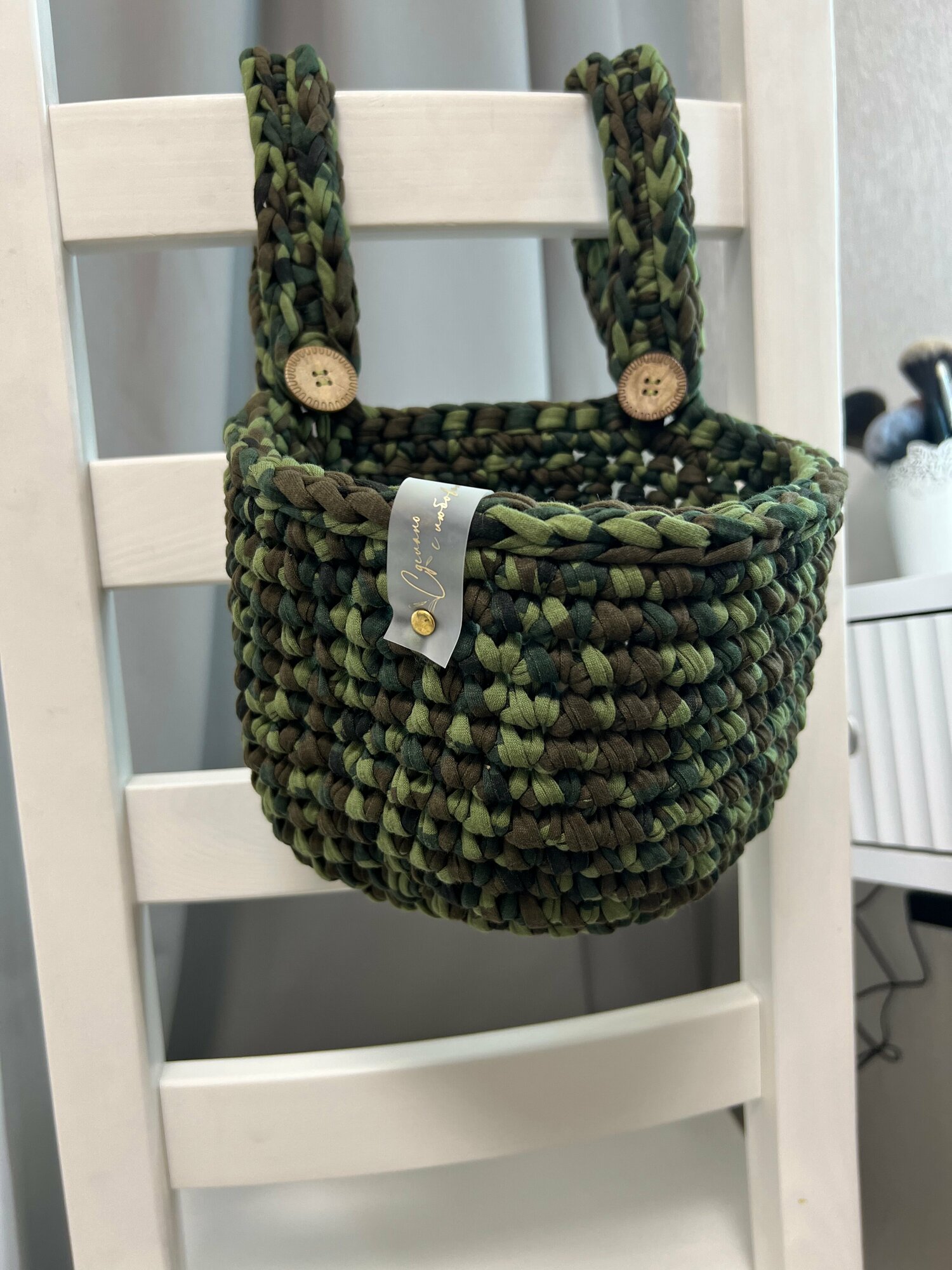 Купить Вязаная корзина на кроватку (милитари)