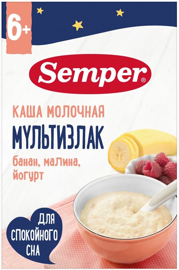 Купить Каша молочная Semper Мультизлаковая с бананом, малиной и йогуртом без добавления сахара детская, с 6 месяцев, 180 г