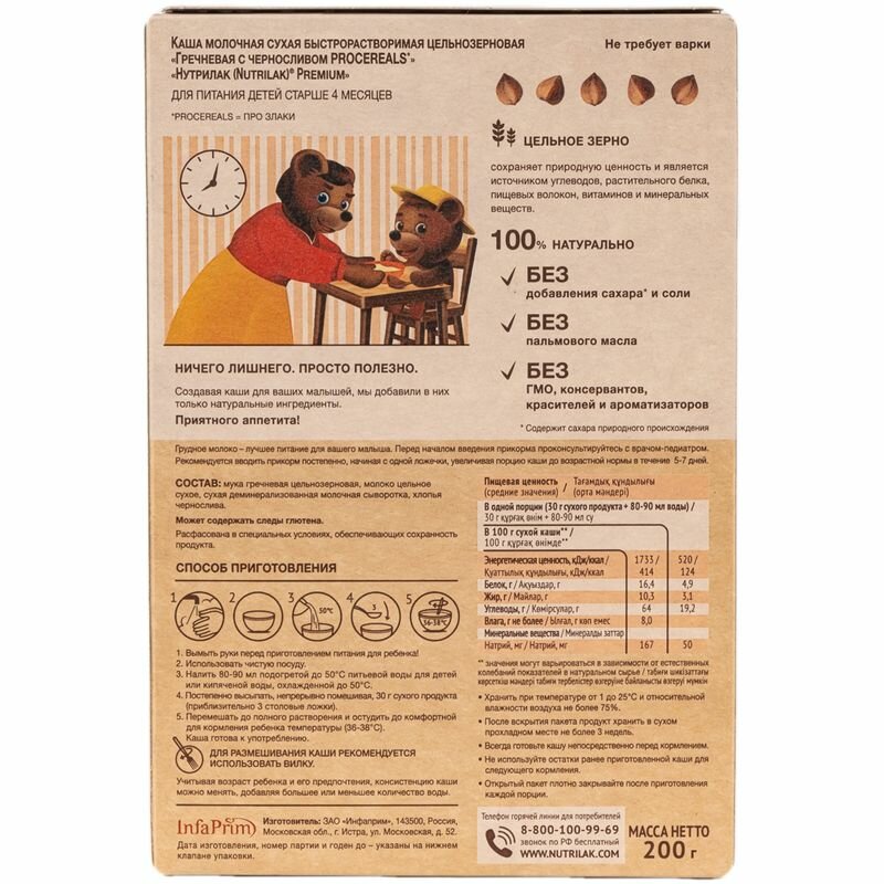 NUTRILAK Premium Каша PROCEREALS Гречневая с Черносливом Цельнозерновая с Молоком {с 4 мес} 200г интересное: