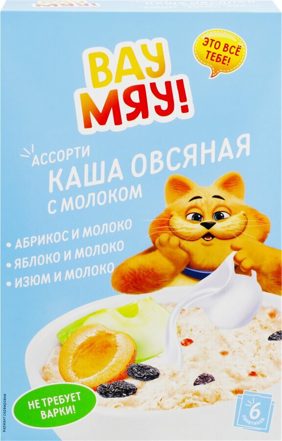 Каша овсяная ВАУ МЯУ Ассорти, молочная с абрикосом, молочная с яблоком, молочная с изюмом, 6х40г интересное: