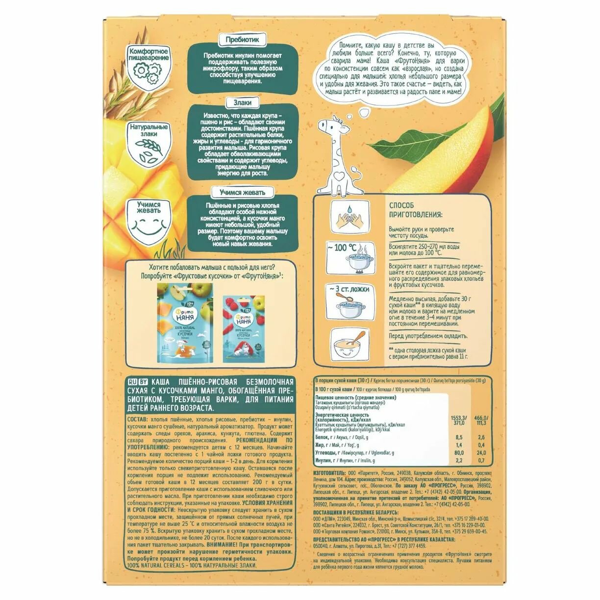 Каша безмолочная детская пшённо-рисовая "ФрутоНяня" с кусочками манго 200 г 6 шт интересное: