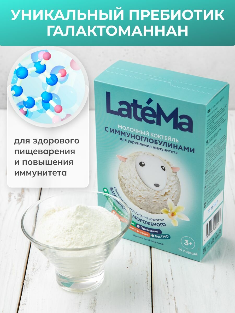 LateMa (Латема) Детская смесь молочная для приготовления молочного коктейля с иммуноглобулинами ванильное мороженое интересное: