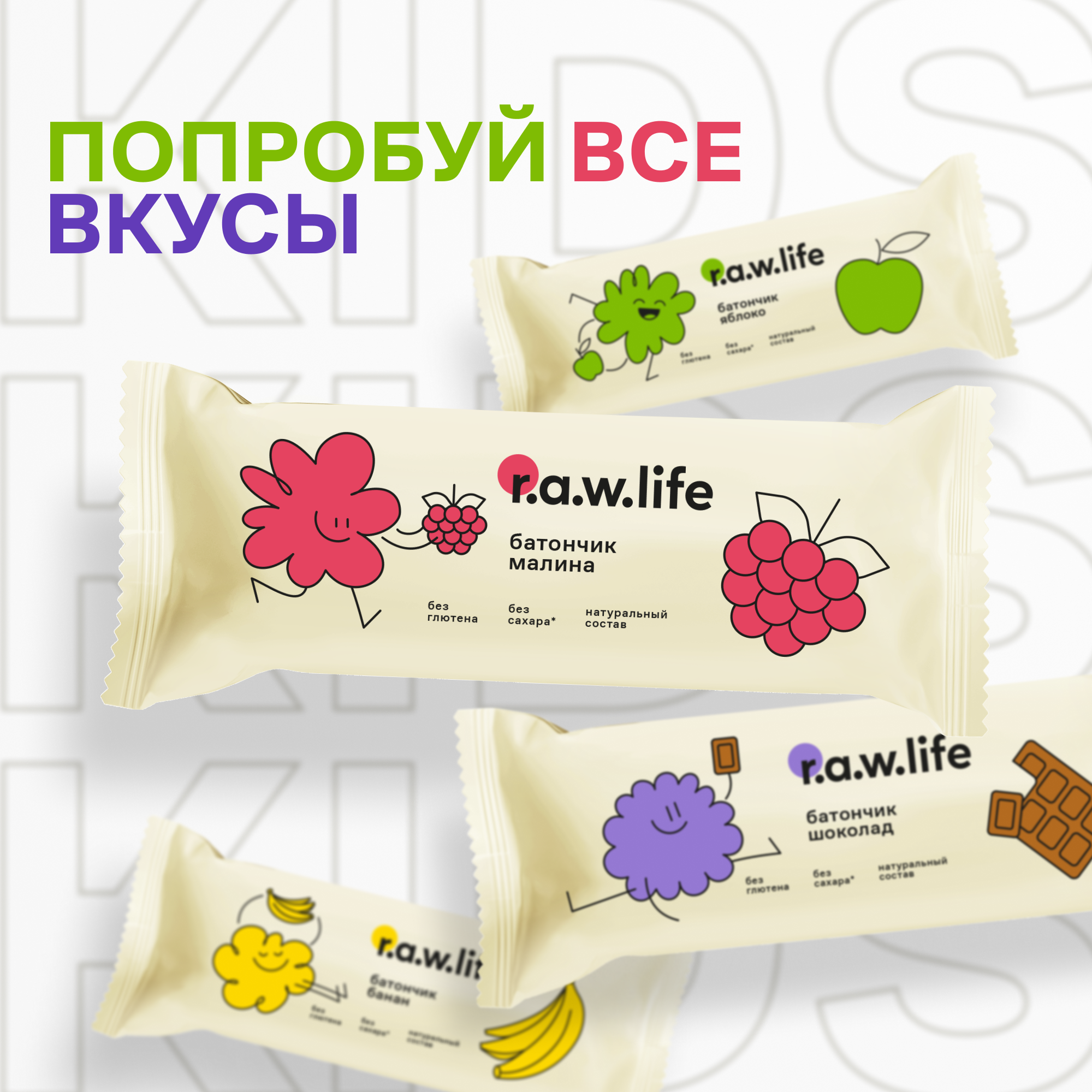 Детские фруктово-злаковые батончики без сахара и глютена R.A.W.LIFE Роулайф, ассорти 12шт по 33г