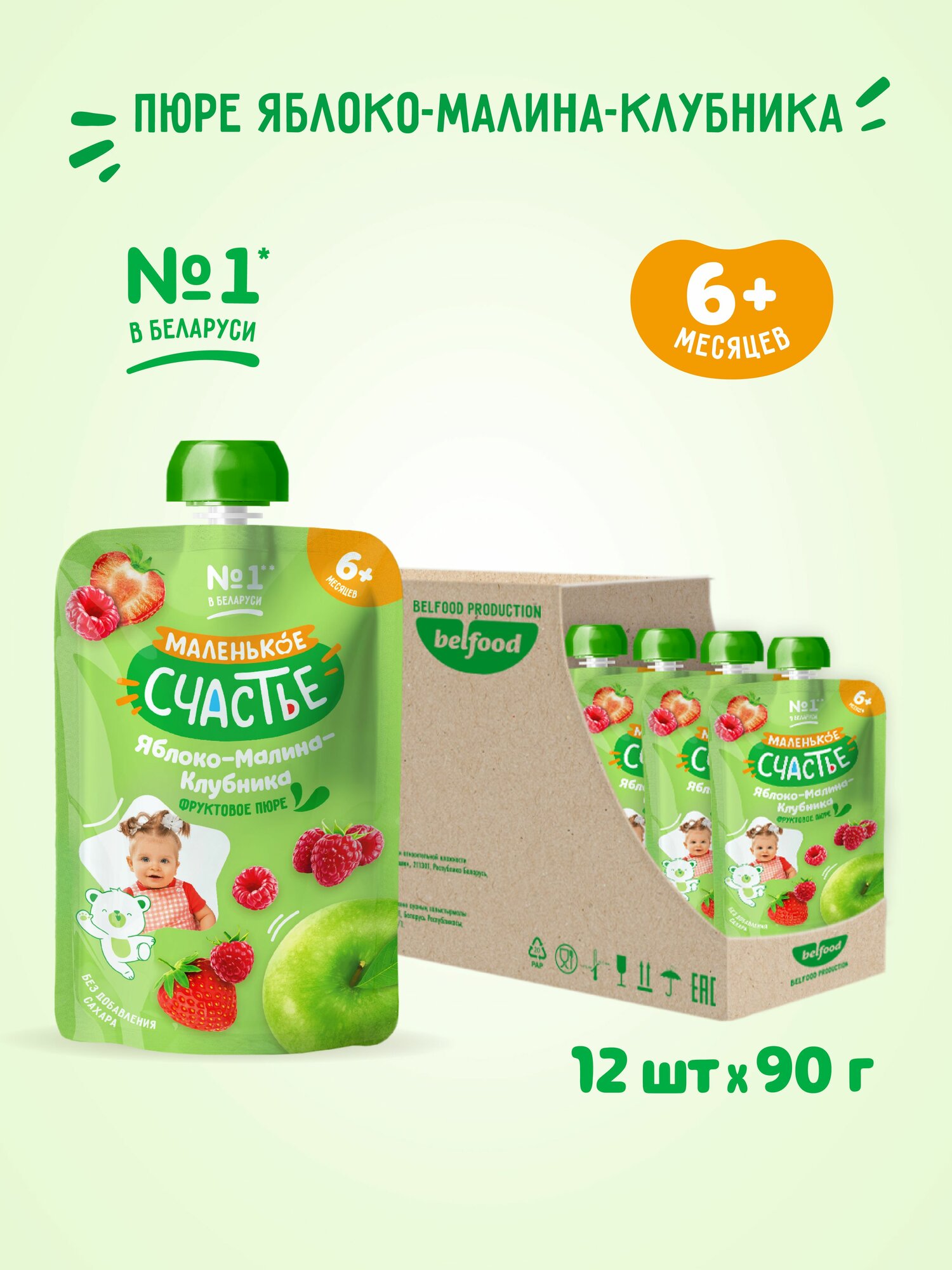 Купить Фруктовое пюре Маленькое счастье Яблоко-Малина-Клубника с 6 месяцев 12 шт по 90г