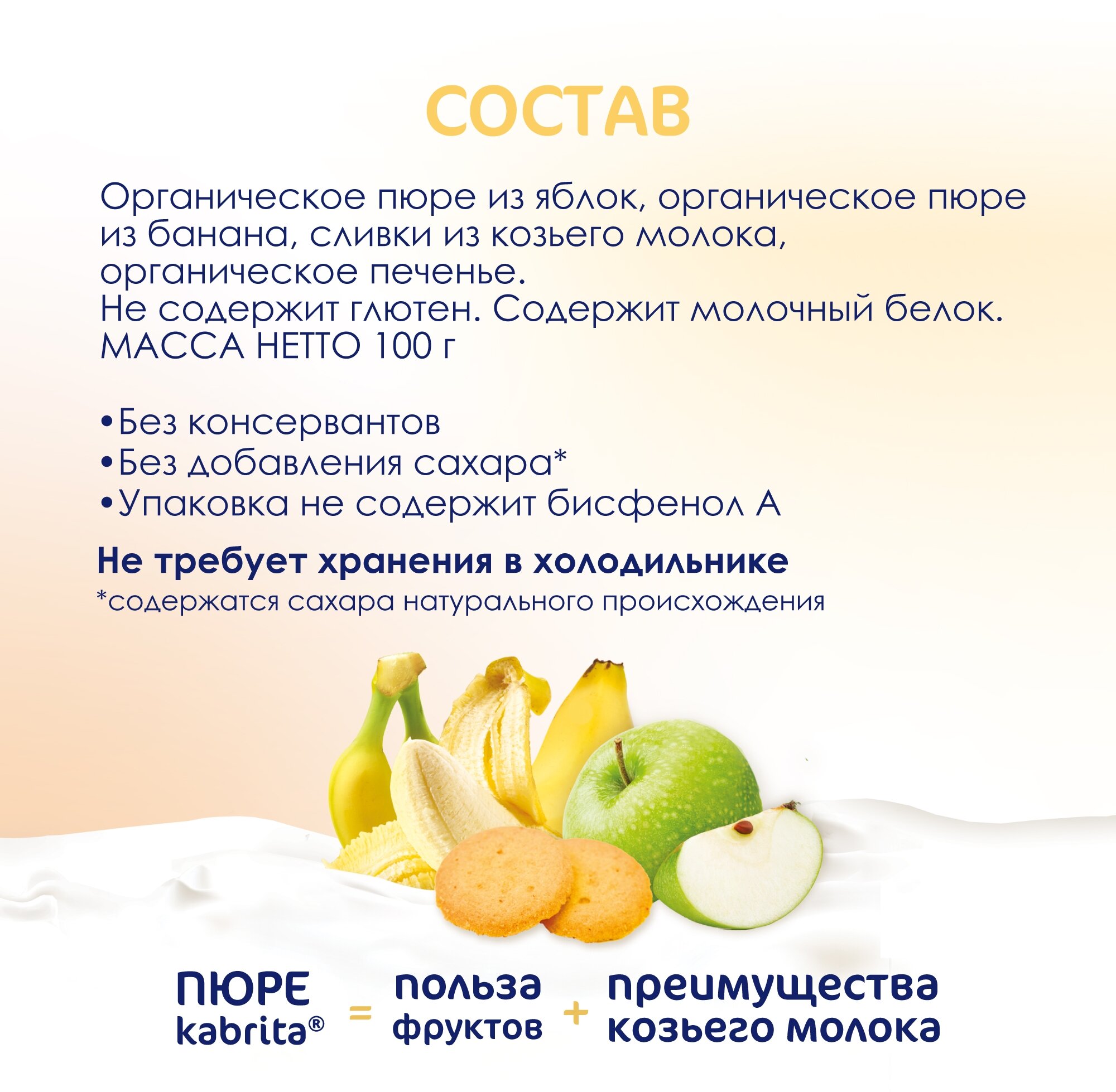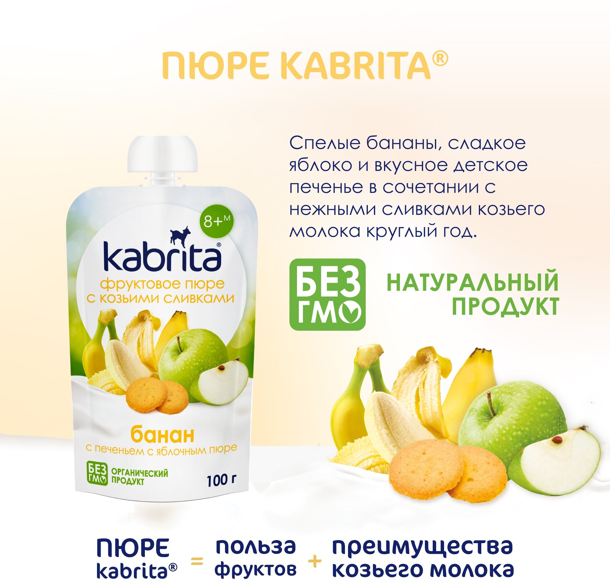 Kabrita банан с печеньем и яблочным пюре и козьими сливками, с 8 месяцев, 100 г, 6 шт. интересное: