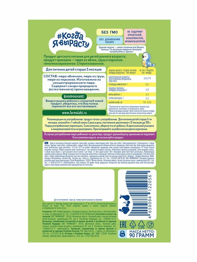 Пюре фруктовое Когда Я вырасту, Яблоко, Груша, Персик, с 5 мес, 90 гр. интересное: