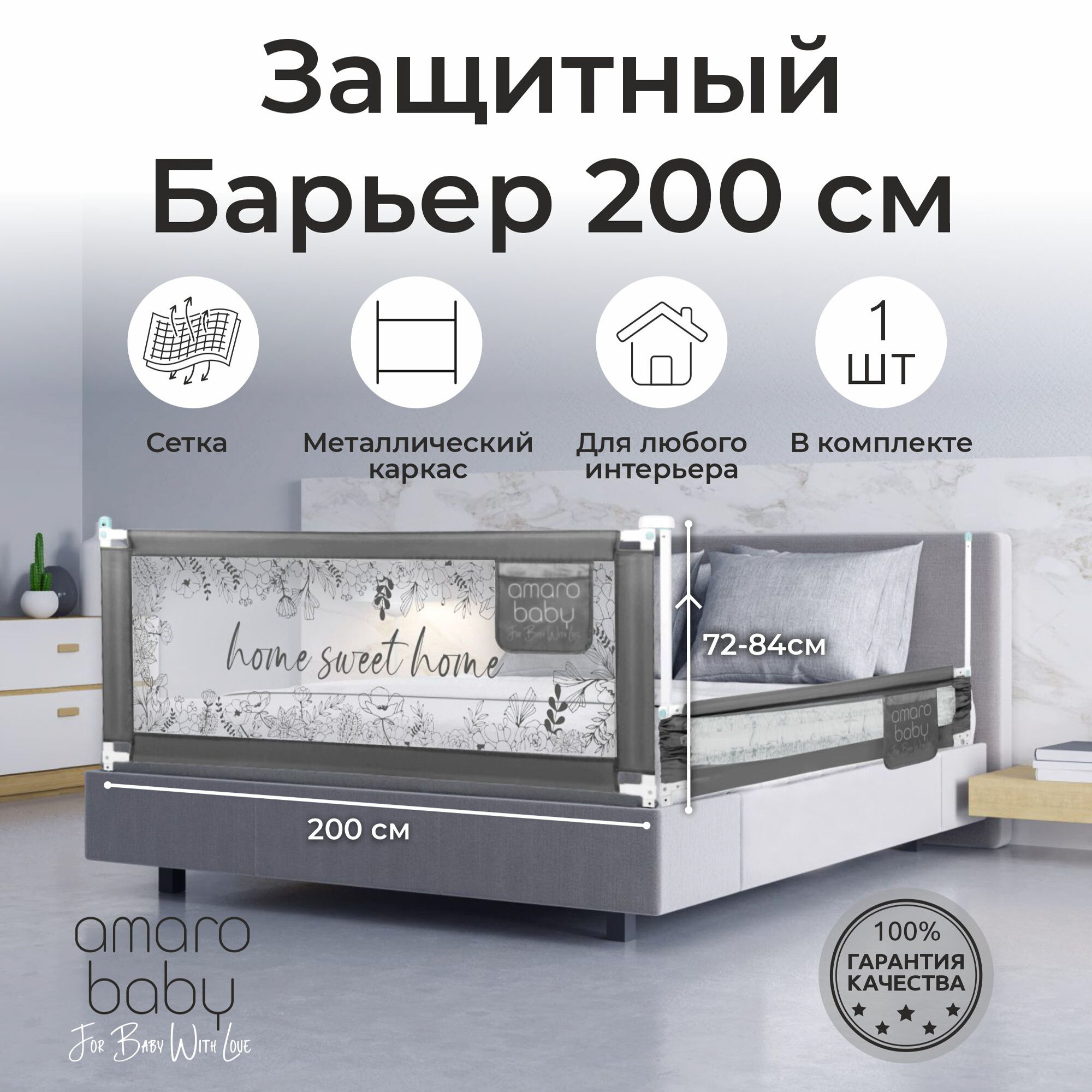 Защитный барьер для кровати 200 см, бортик для кровати от падения, детское ограждение от 0 до 10 лет, металл, (1 шт)