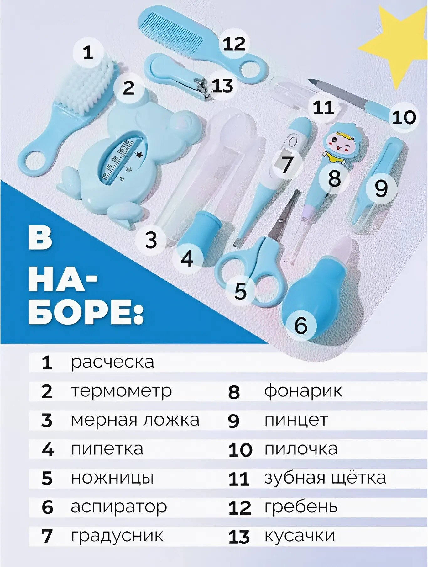 Набор для ухода за новорожденным 13 предметов, голубой интересное: