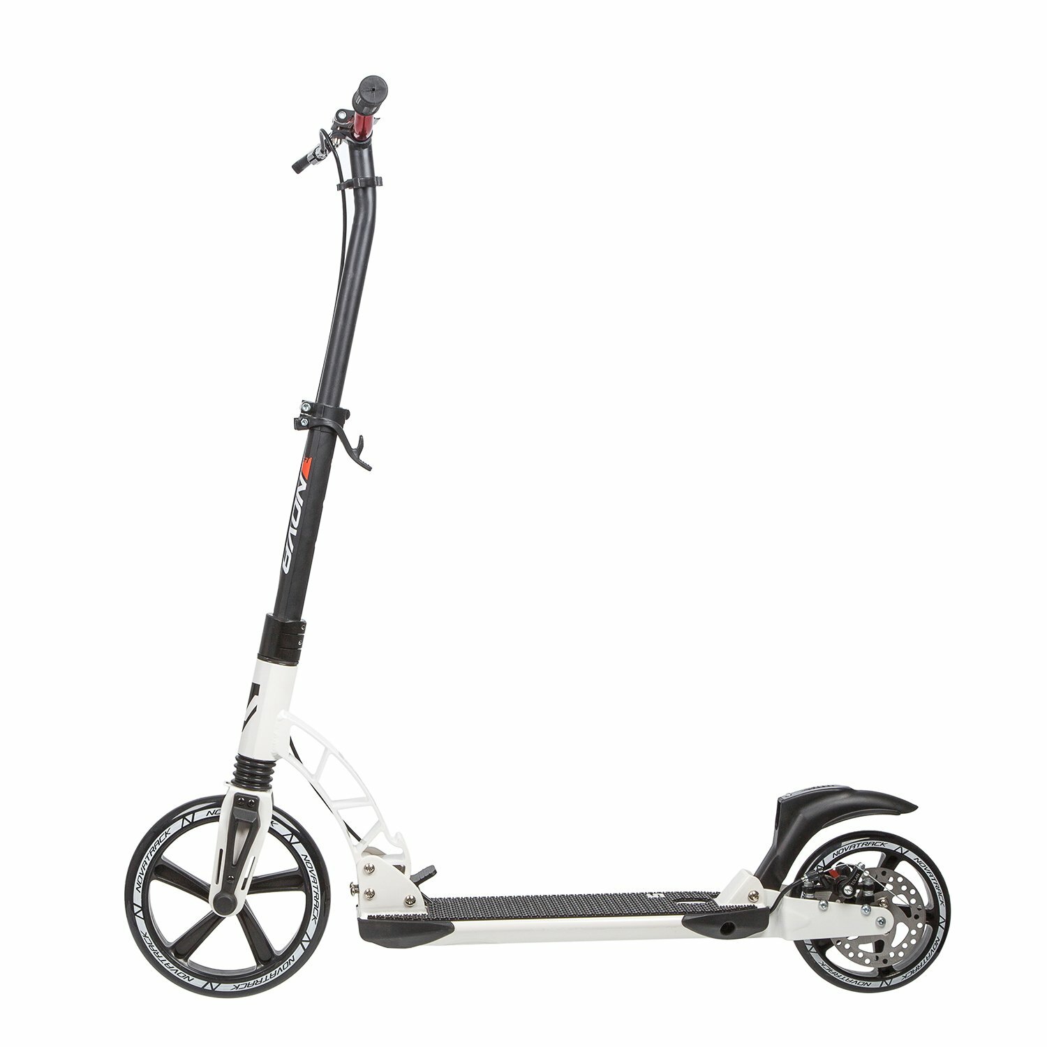 Самокат для детей NOVATRACK DEFT PRO алюм., передний и задний амортизатор, колеса 250*200 мм PU, эргономичный Y-руль с фиксатором складных рукоятей, платформа с резиновым верхним покрытием, дисковый тормоз, черно-белый