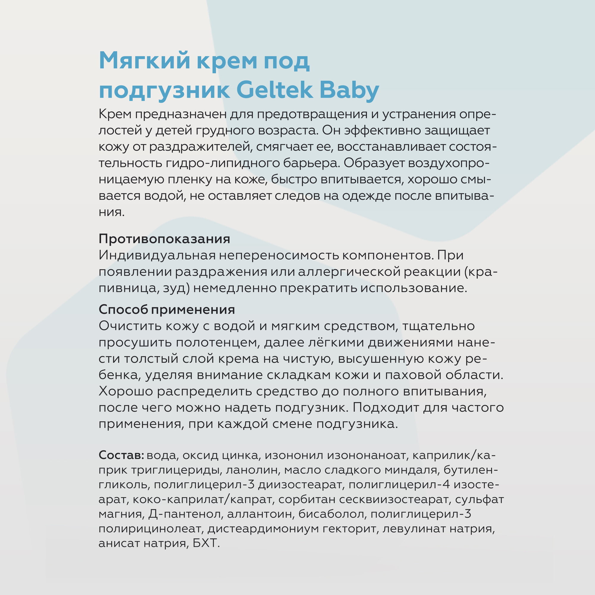 Geltek Baby Мягкий крем детский для новорожденных под подгузник 0+, 50 мл интересное: