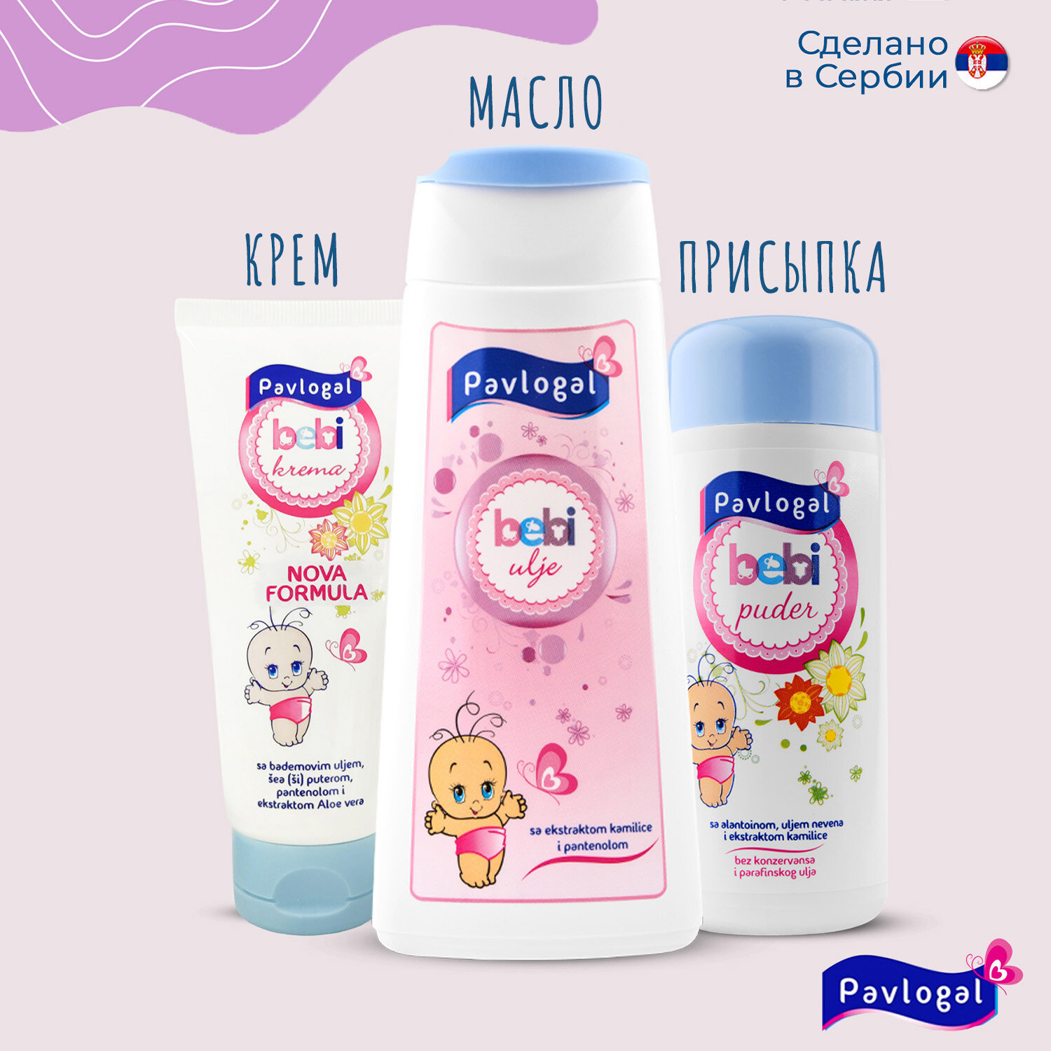 Купить Набор детский Pavlogal Присыпка 100гр, крем для лица и тела с цинком и календулой 80мл, масло 200мл