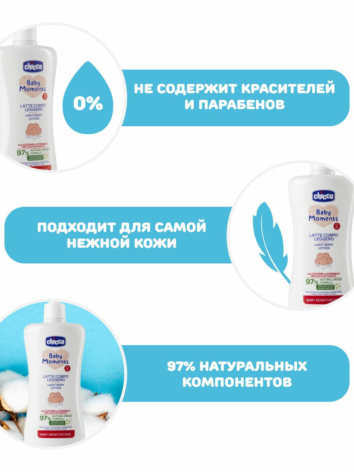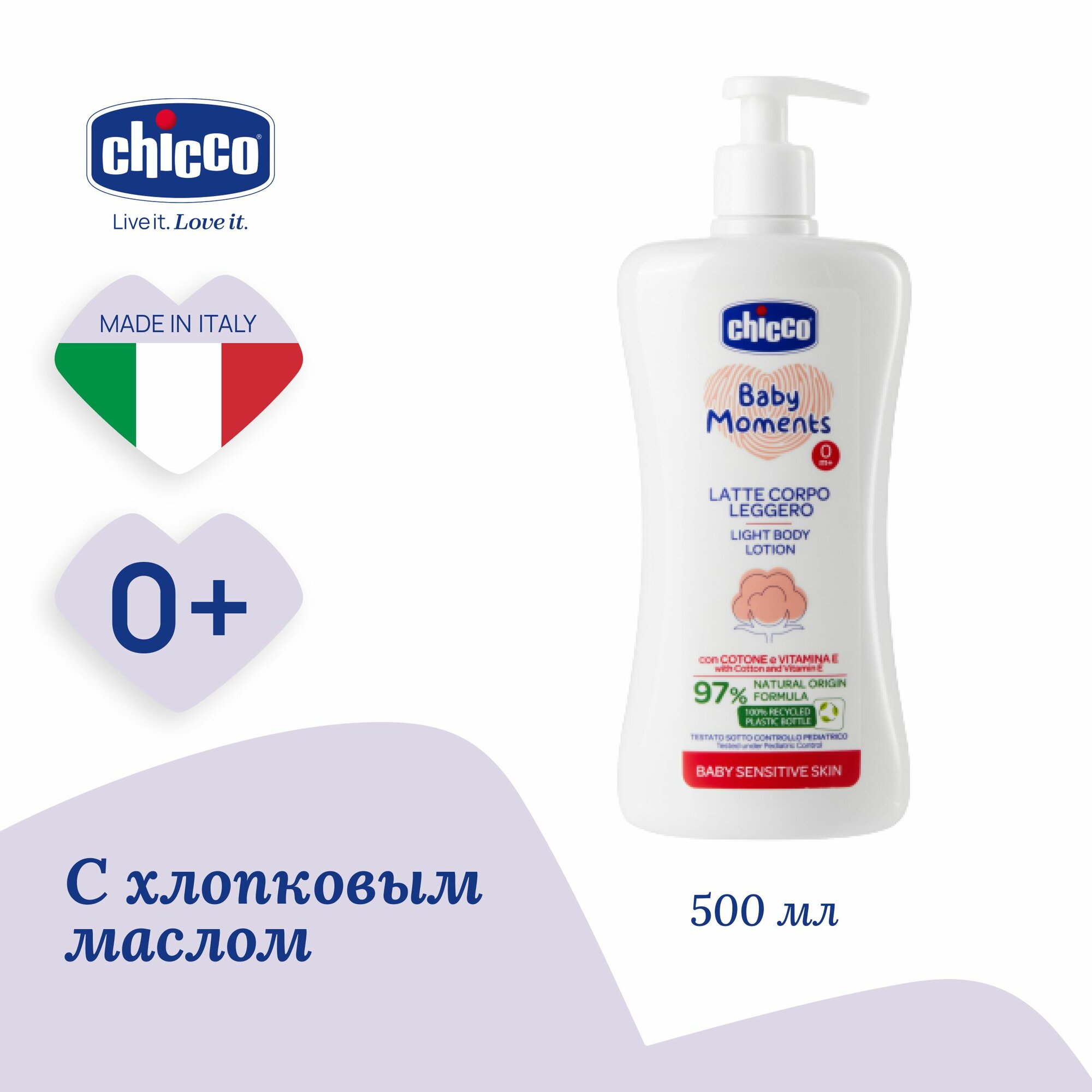 Увлажняющее детское молочко для тела Chicco Baby Moments Лосьон для чувствительной кожи с хлопком и витамином Е 500 мл 0+ интересное: