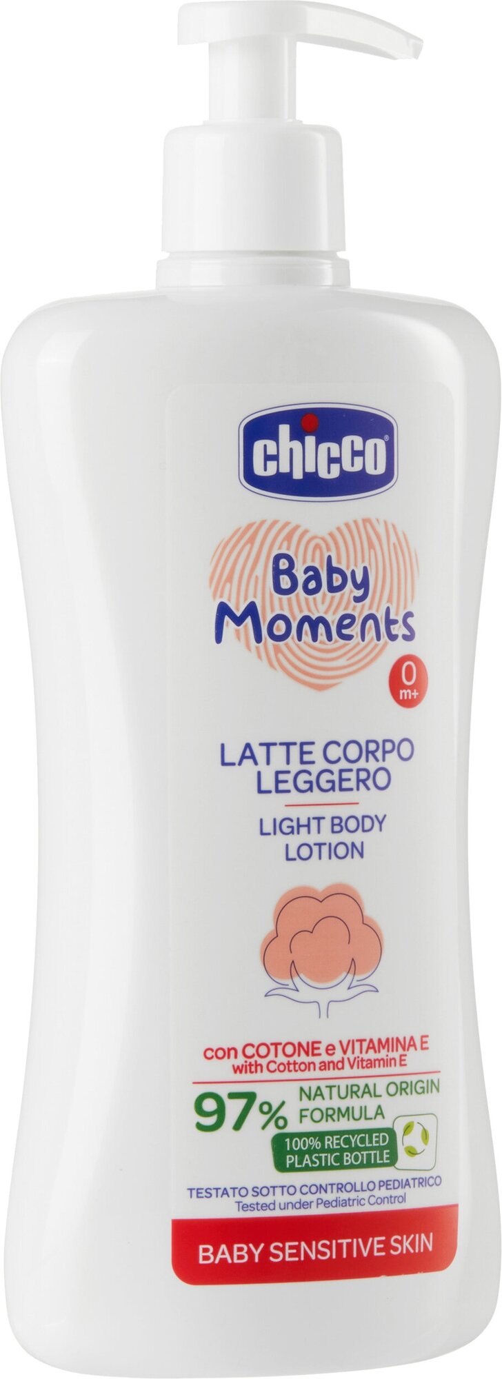 Купить Увлажняющее детское молочко для тела Chicco Baby Moments Лосьон для чувствительной кожи с хлопком и витамином Е 500 мл 0+
