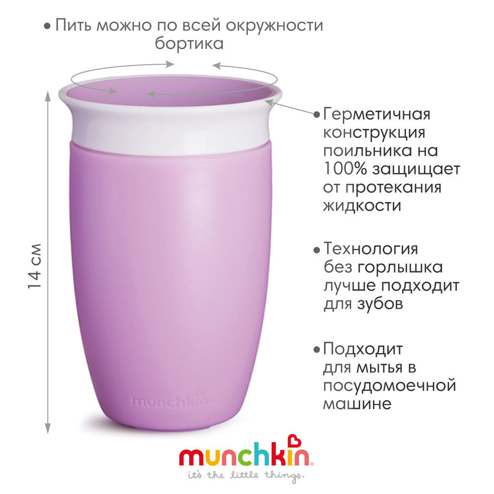 Поильник непроливайка детский Munchkin MIRACLE® 360° сиреневый, 207 мл/296 мл. с 6 мес, с крышкой интересное: