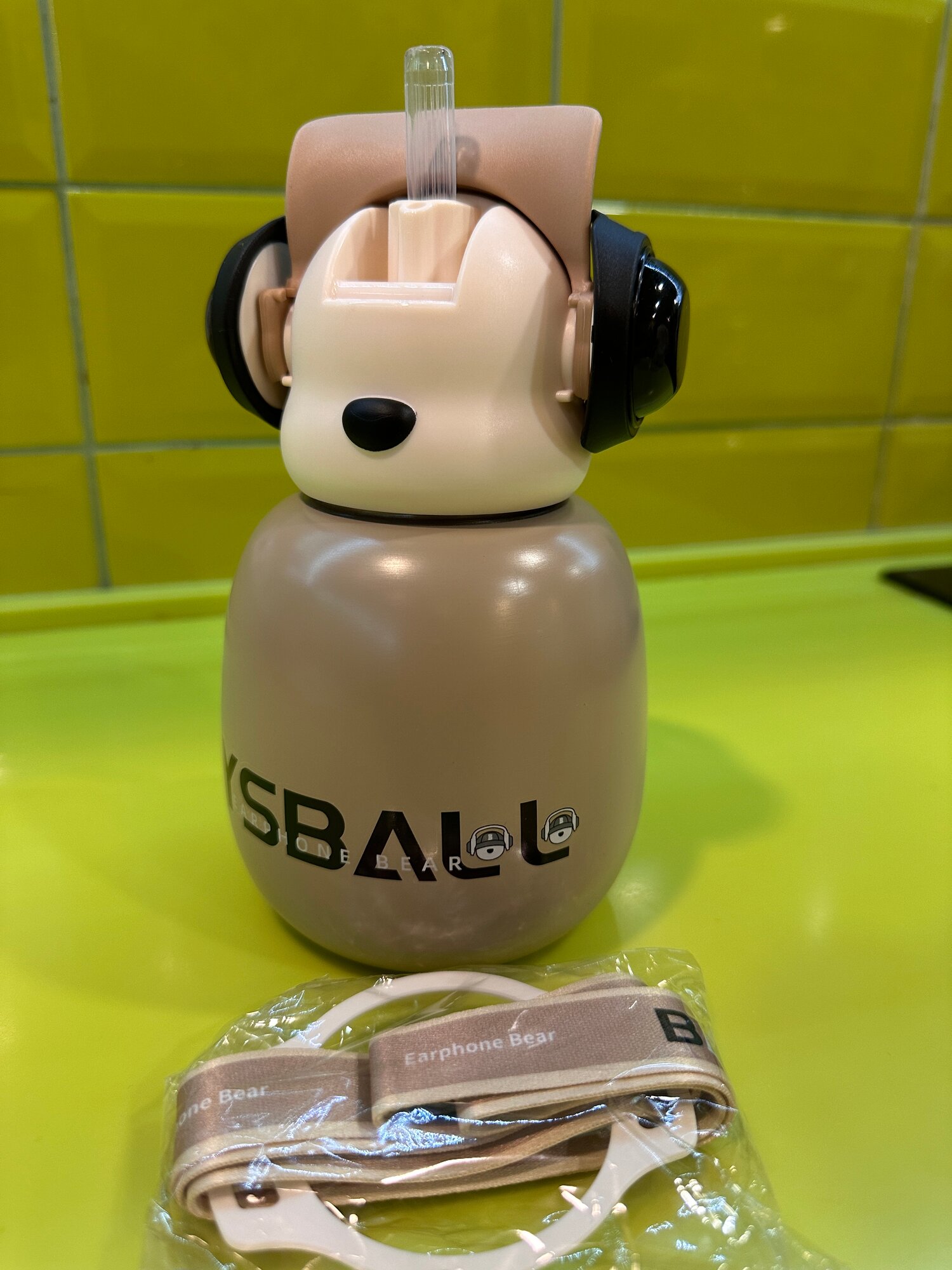 Купить Термос поильник, Мишка, бутылочка бежевая 460 мл с датчиком температуры, трубочкой и ремешком
