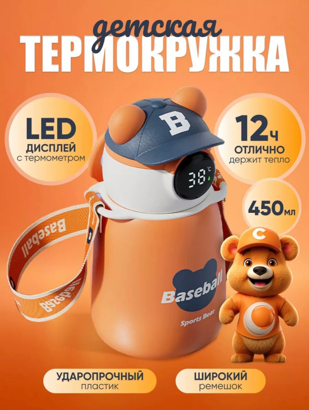 Термос поильник, Мишка, бутылочка оранжевая 450 мл с датчиком температуры с трубочкой и ремешком интересное: