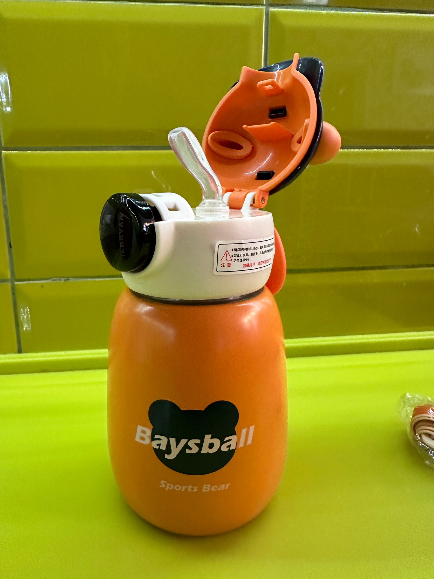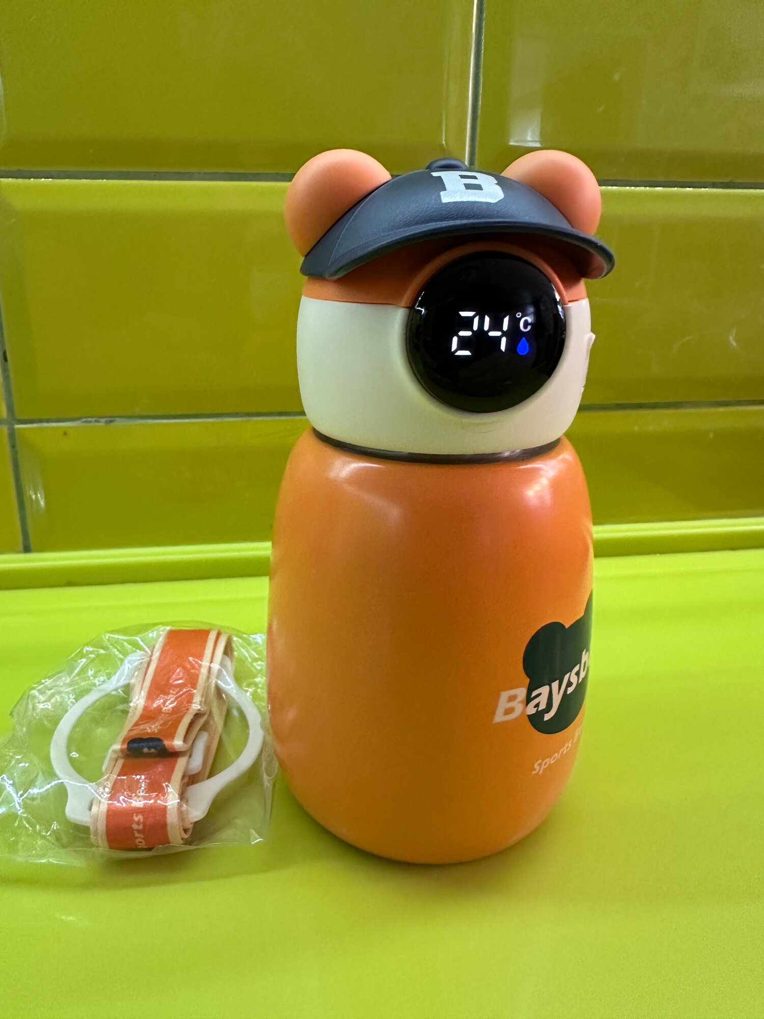 Купить Термос поильник, Мишка, бутылочка оранжевая 450 мл с датчиком температуры с трубочкой и ремешком