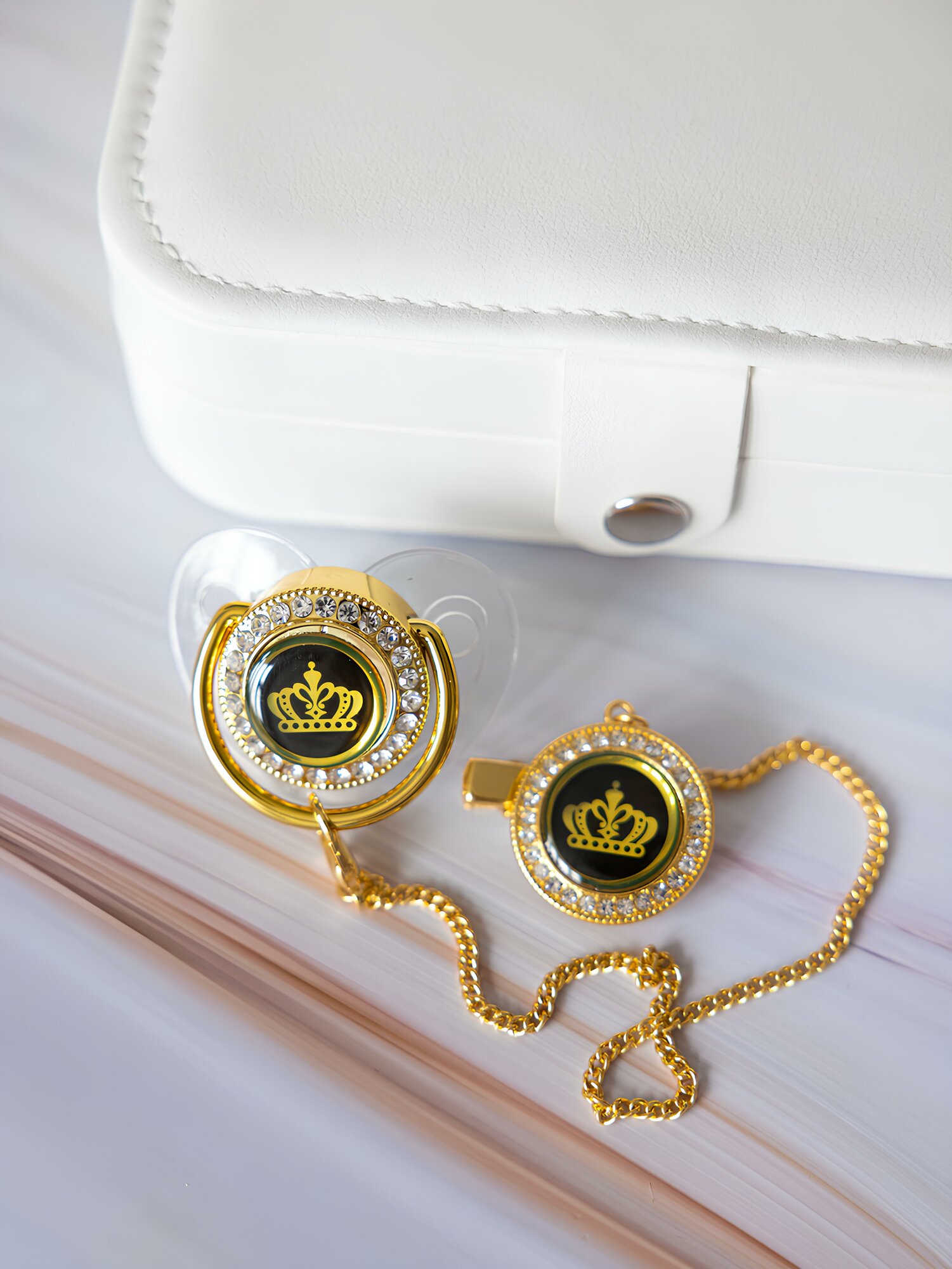 Золотая пустышка с короной и держателем