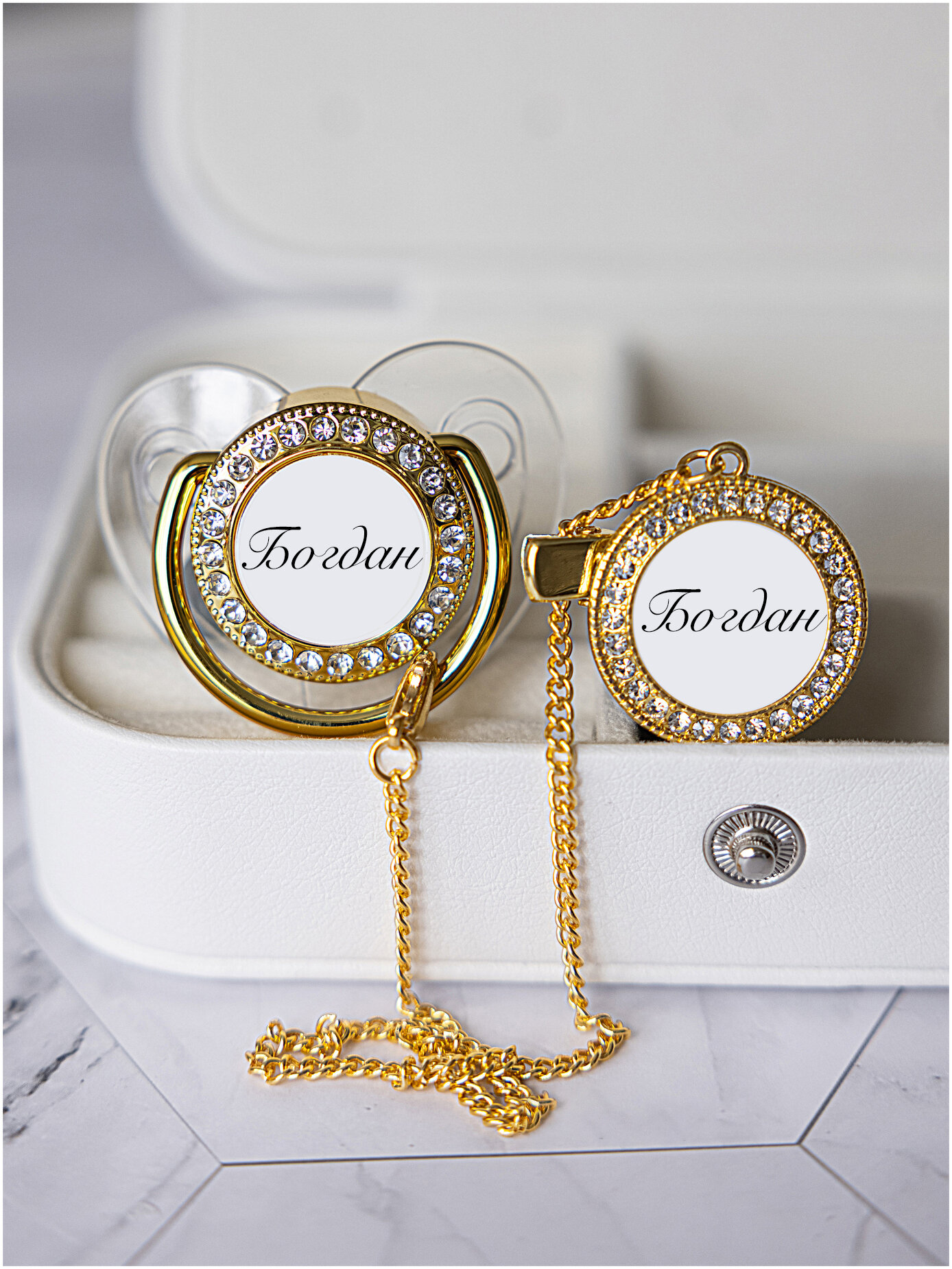 Купить Именная пустышка Богдан для новорождённого и держатель