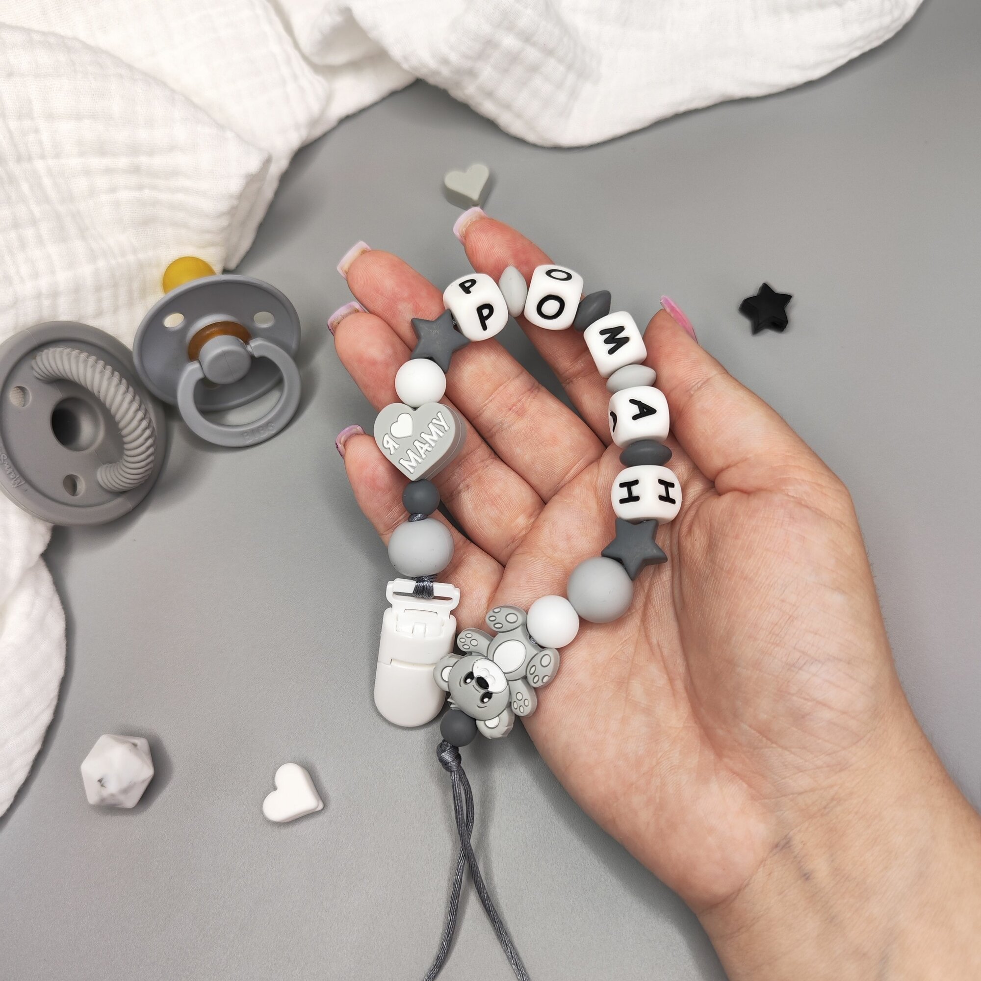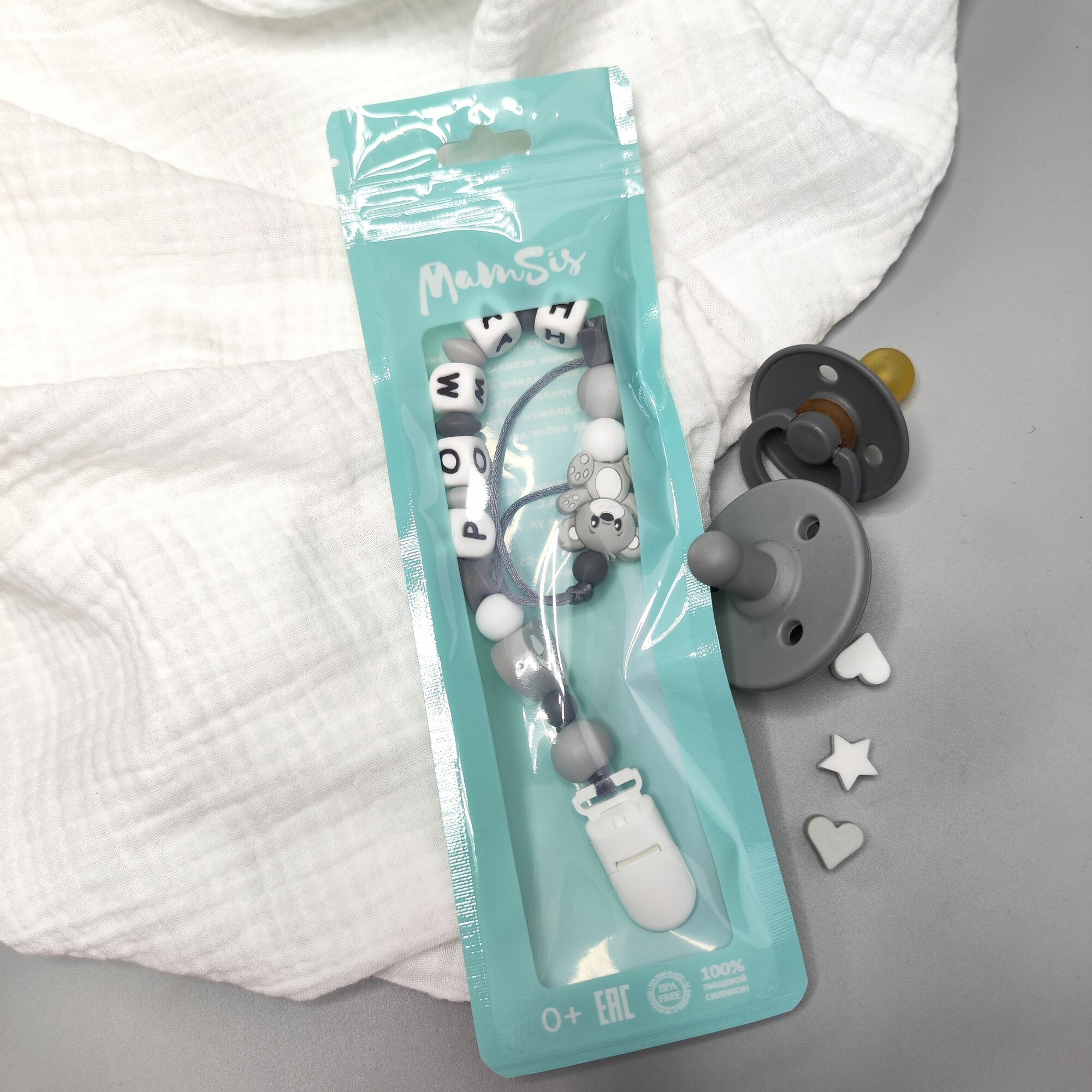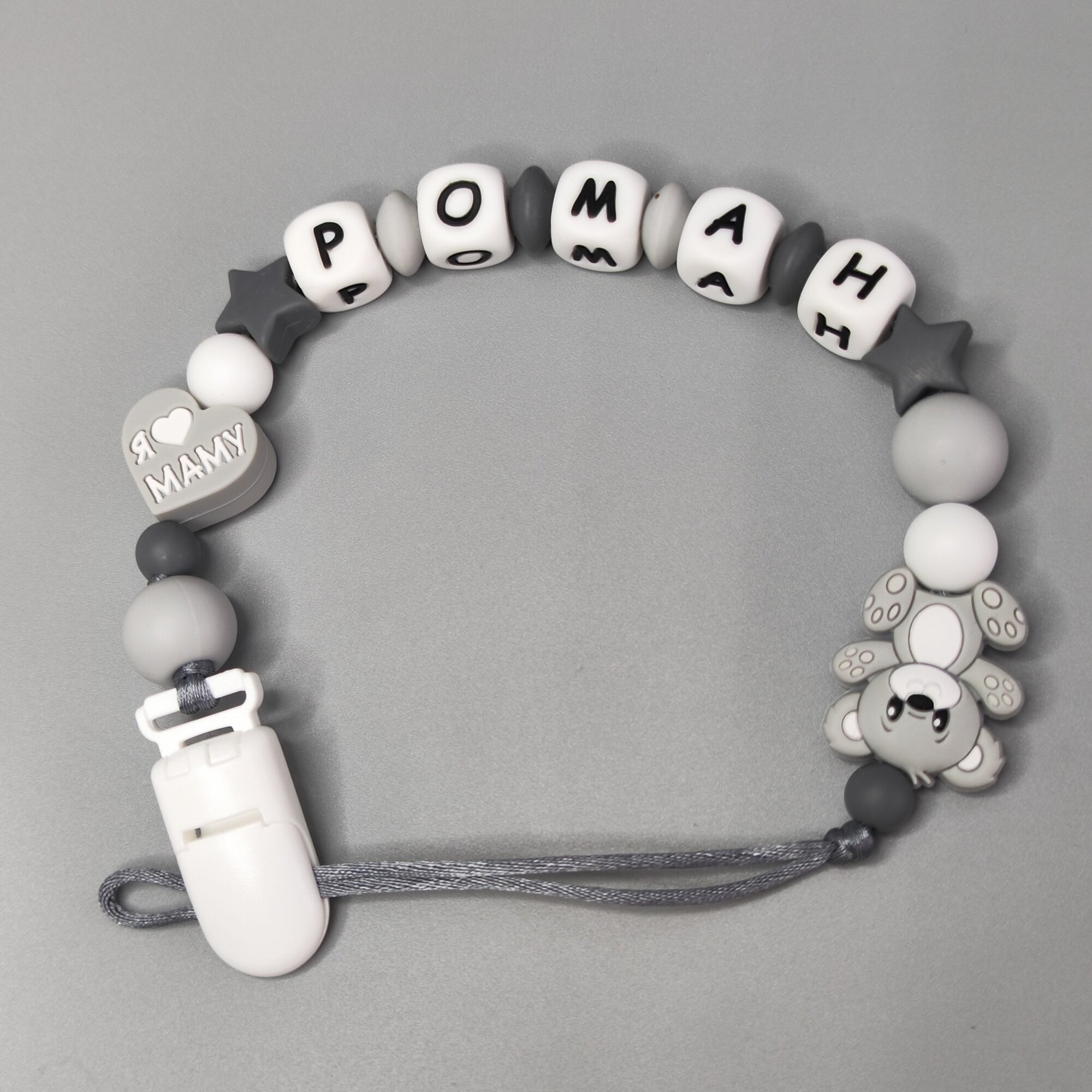 Именной силиконовый держатель пустышки с грызунком, Роман, Рома, Ромка, прищепка для соски, для новорожденных, грызунок