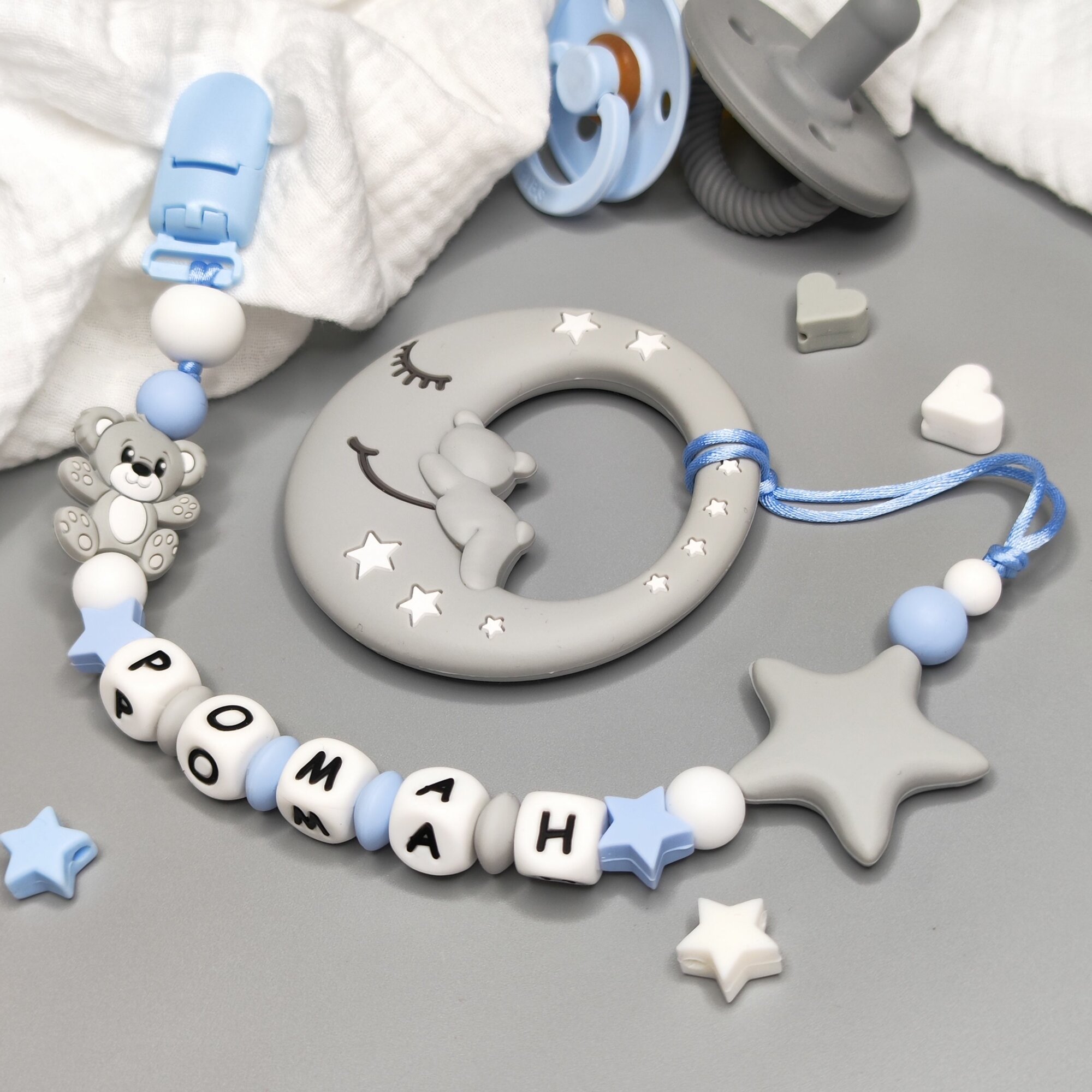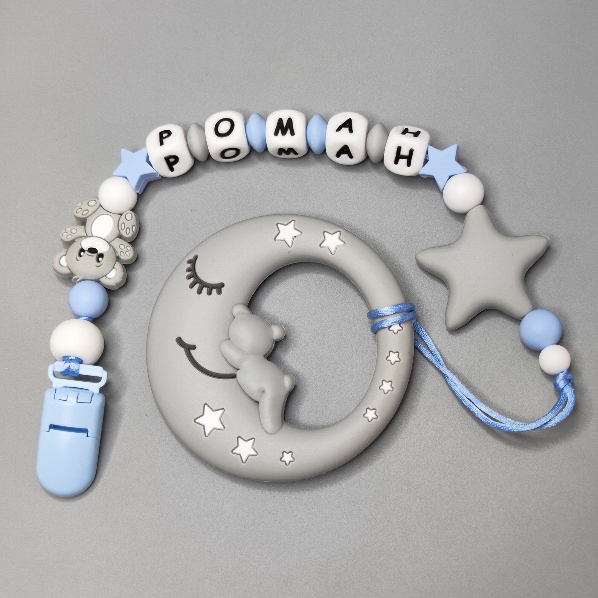 Именной силиконовый держатель пустышки с грызунком, Роман, Рома, Ромка, прищепка для соски, для новорожденных, грызунок