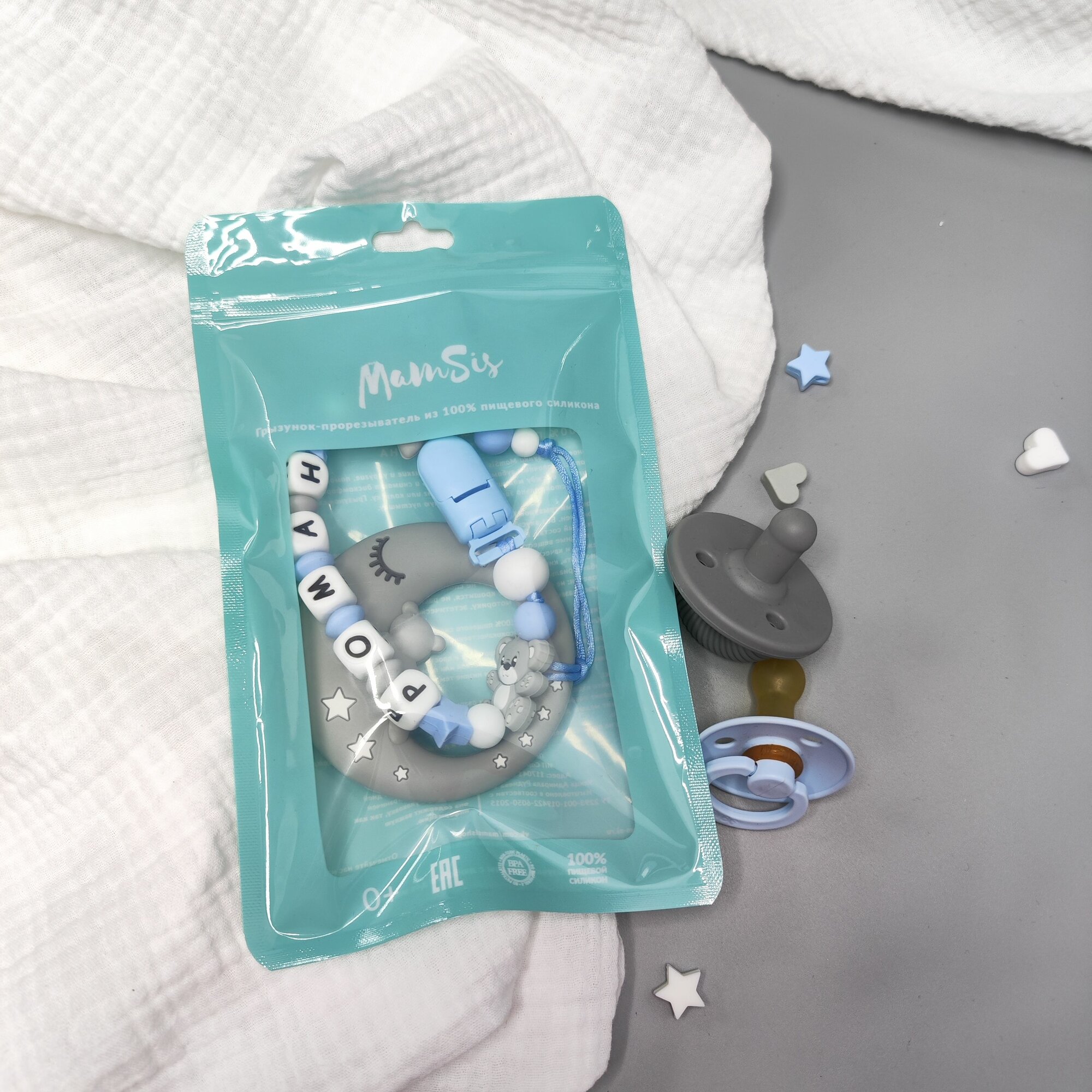 Именной силиконовый держатель пустышки с грызунком Роман для новорожденных интересное: