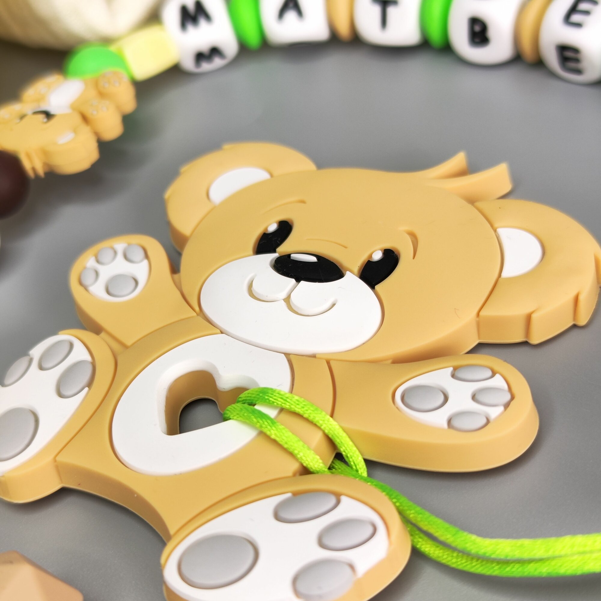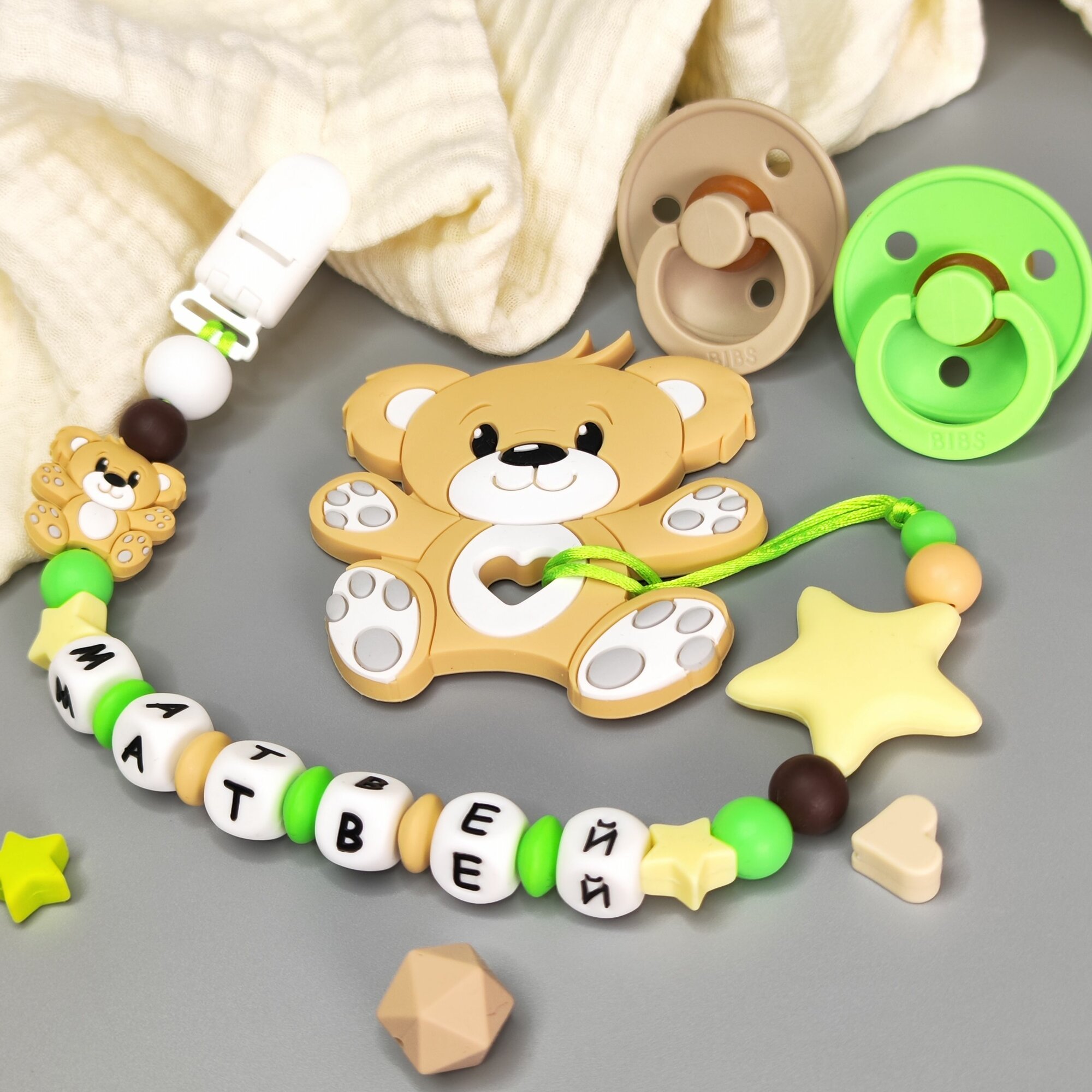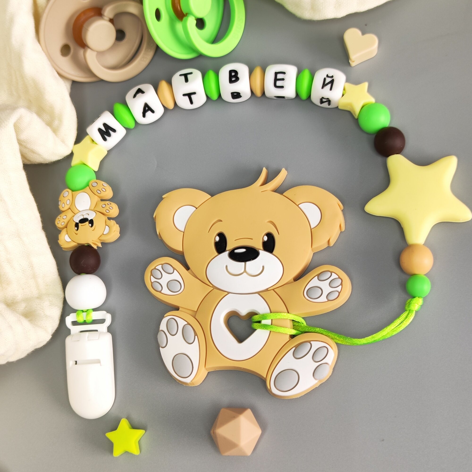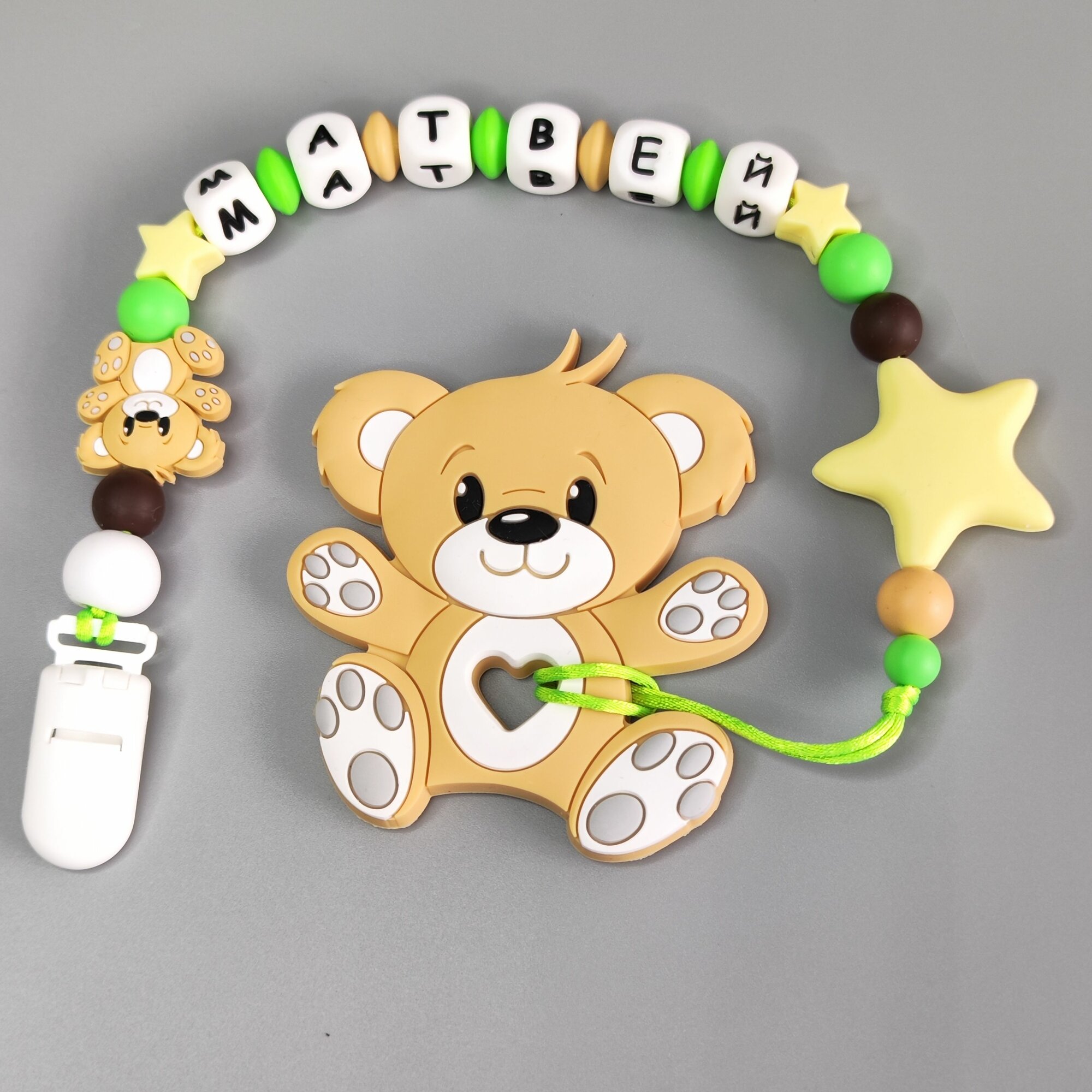 Именной силиконовый держатель для пустышки с грызунком - Матвей, для новорожденных, прорезыватель интересное:
