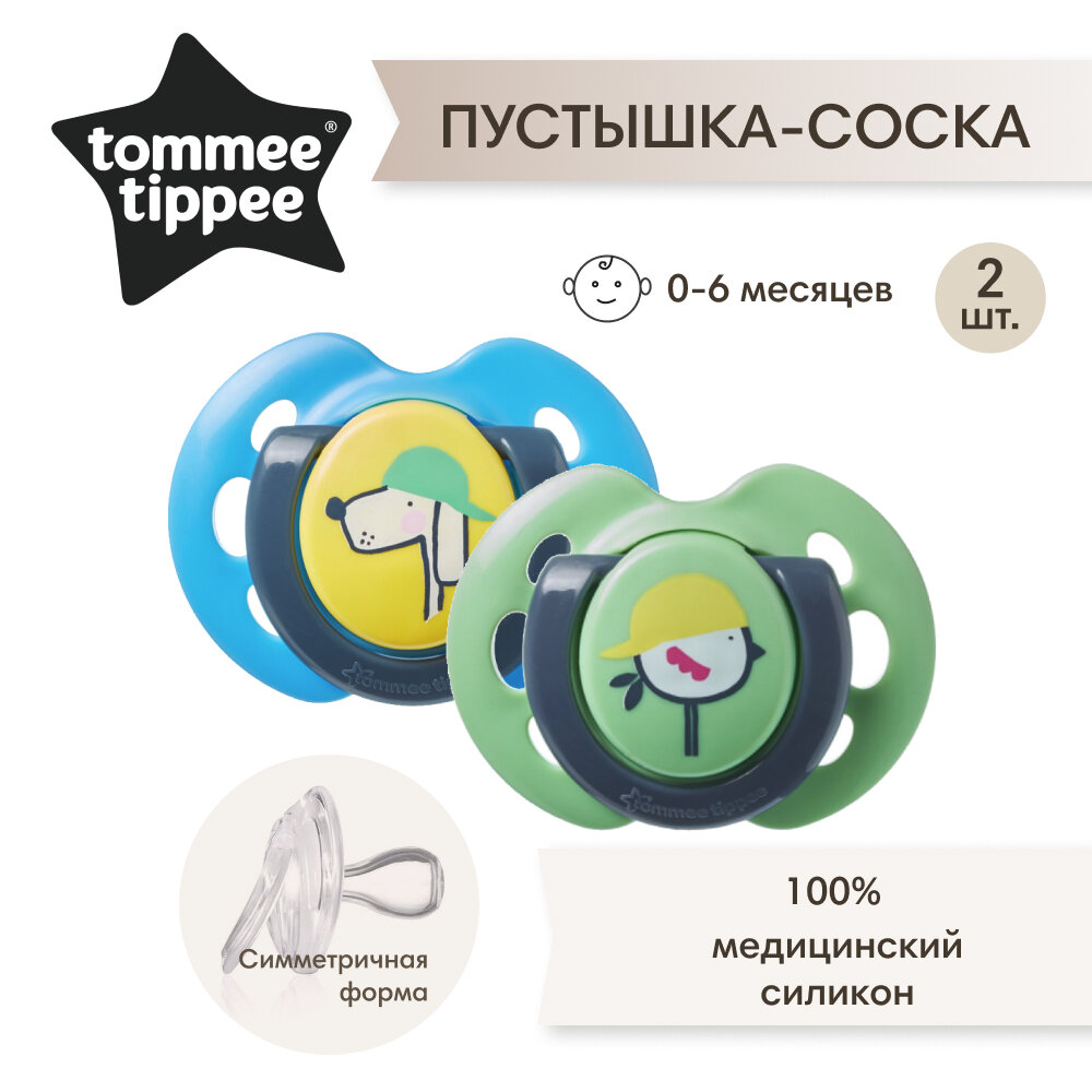 Соска-пустышка Tommee Tippee силиконовая Fun Style, 0-6 мес, 2 шт. зеленая/голубая интересное: