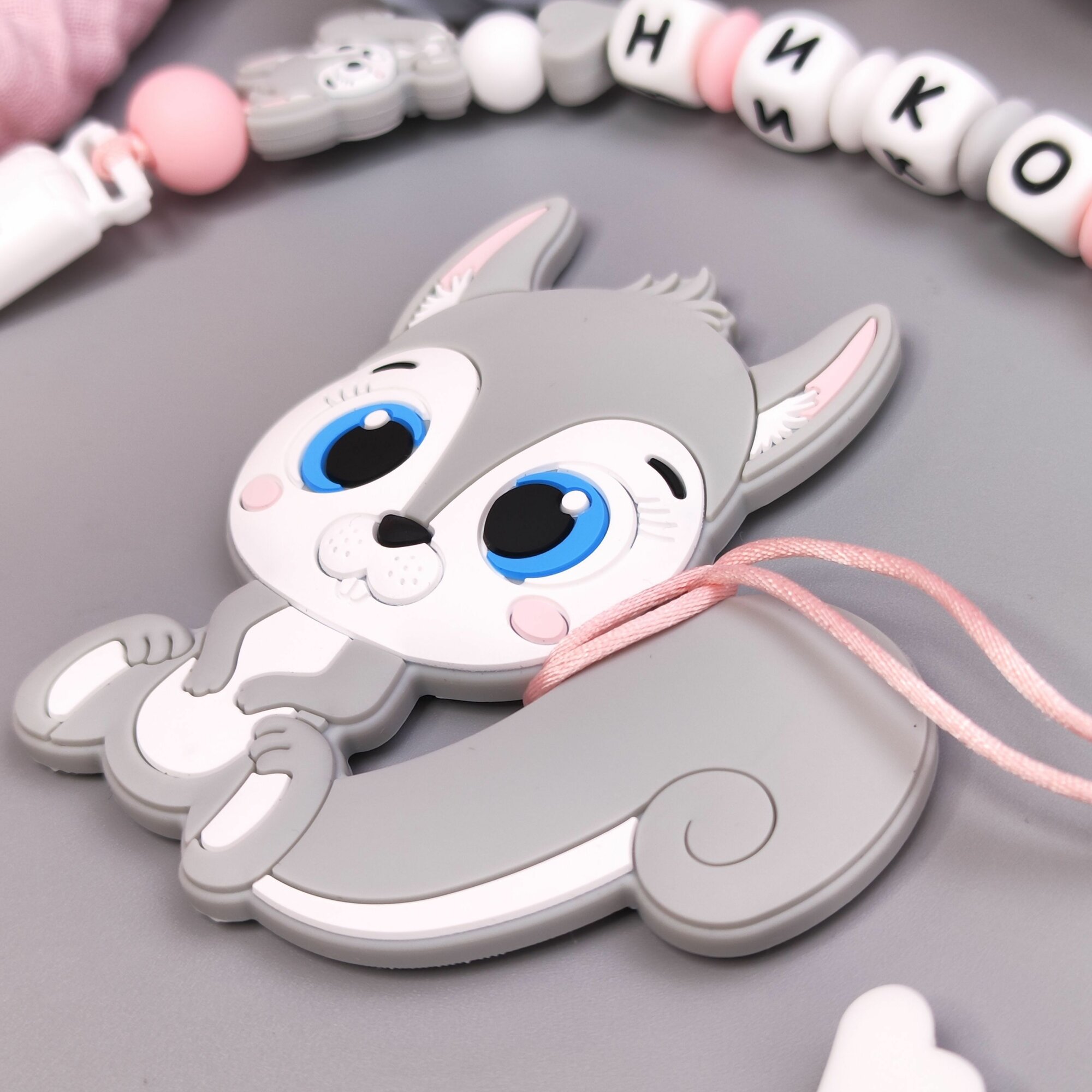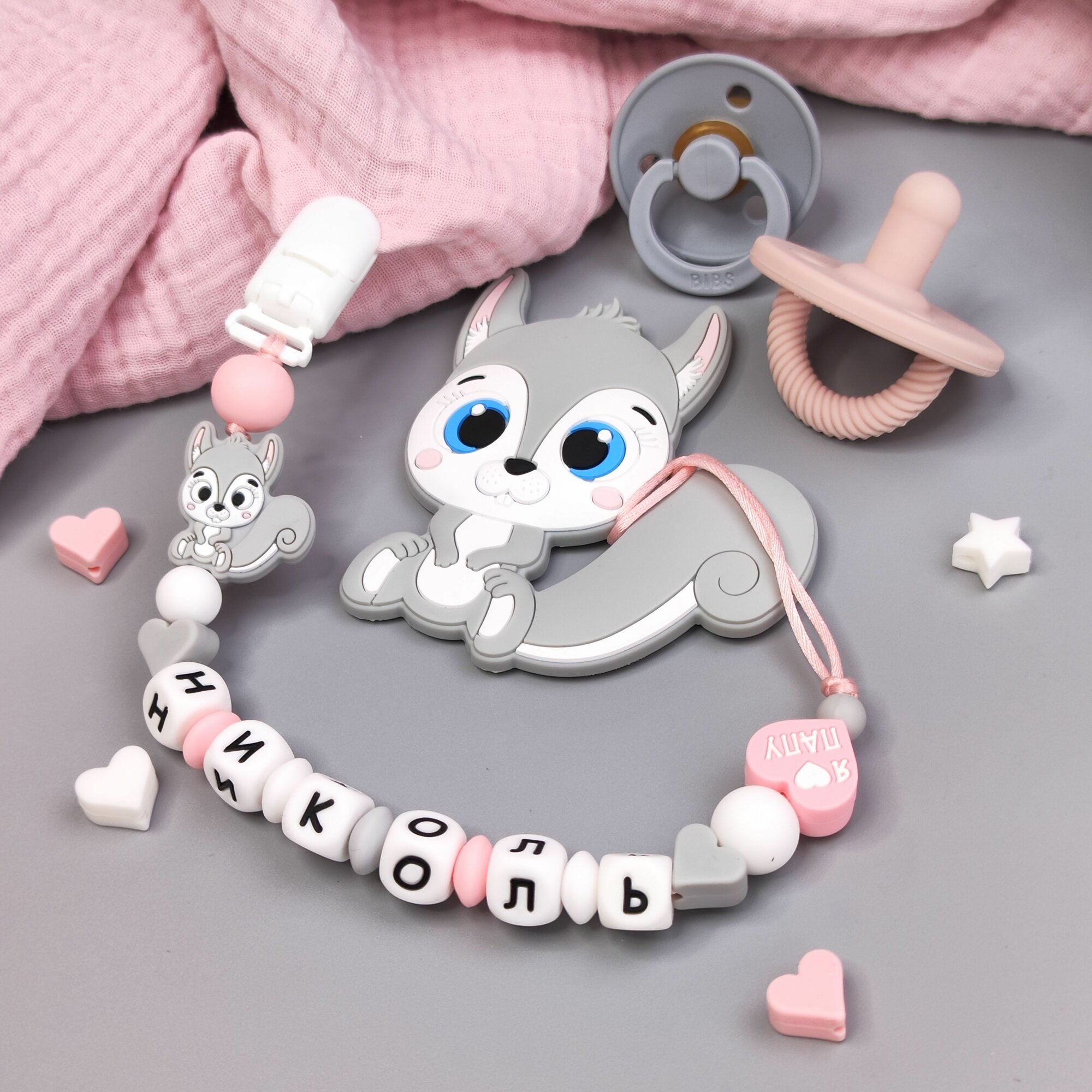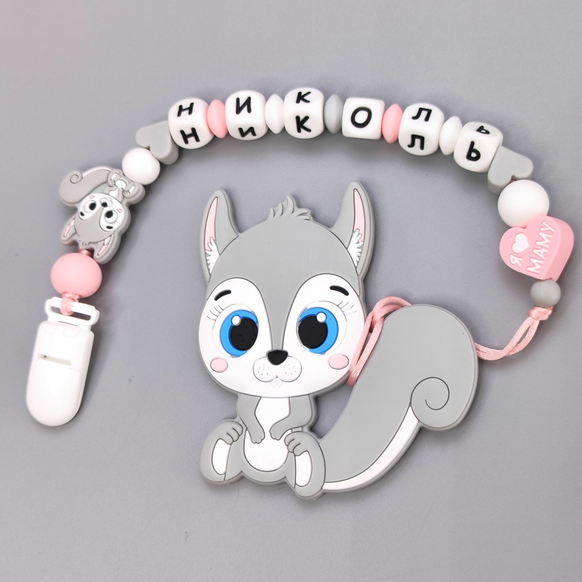 Именной силиконовый держатель для пустышки с грызунком - Николь, прорезыватель интересное: