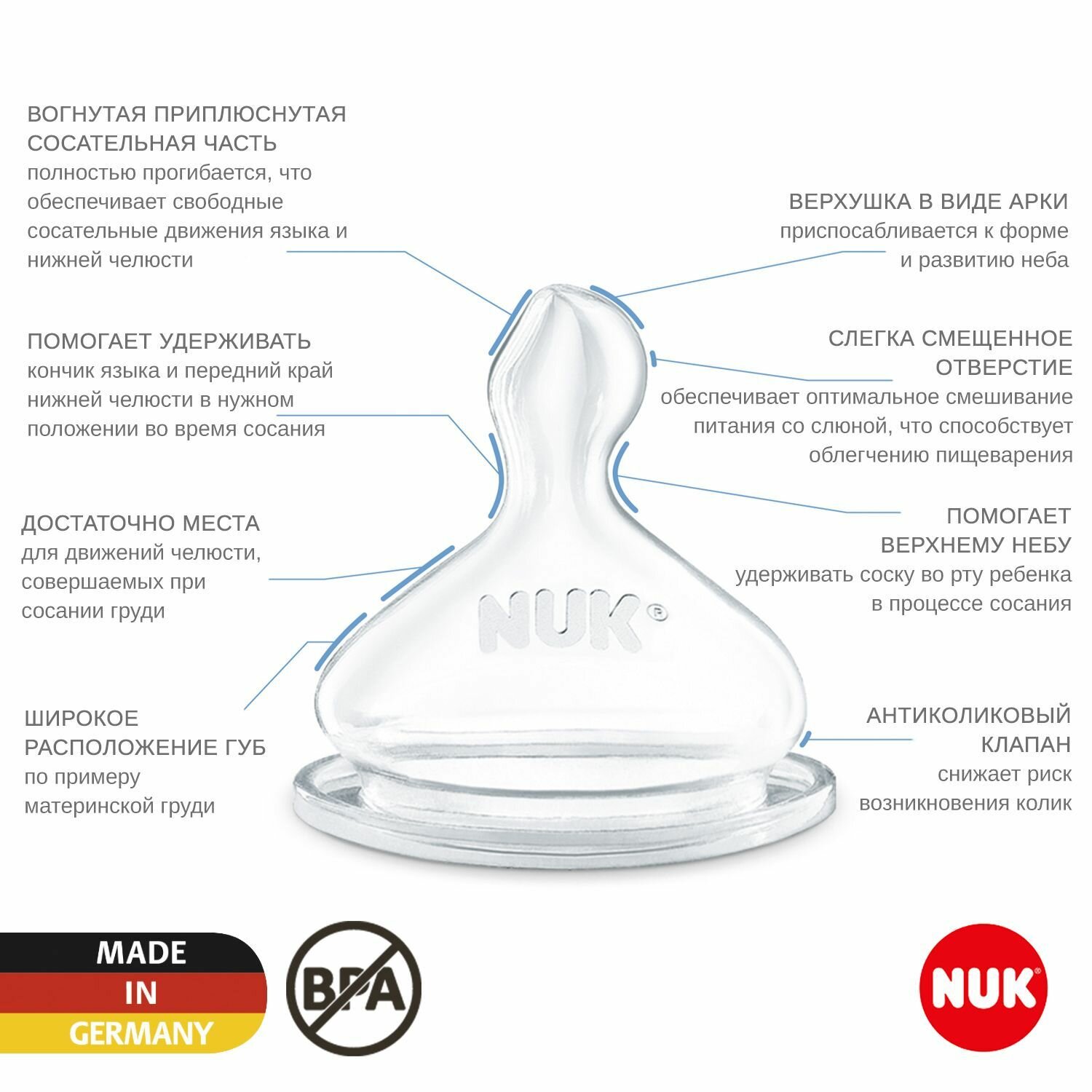 NUK FC+ Соска для бутылочки силиконовая с отверстием Flow Control, 6-18 месяцев, 2 шт